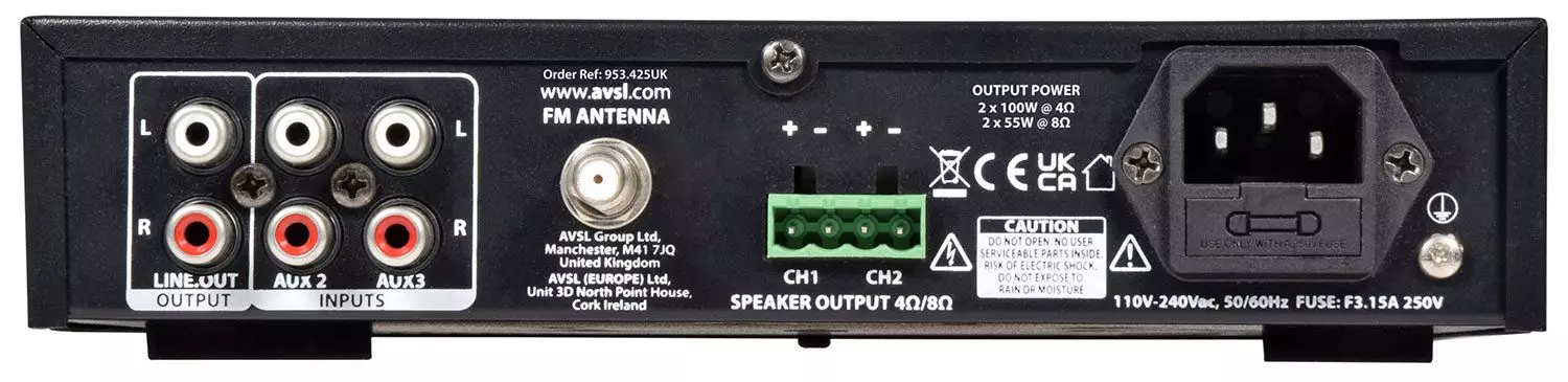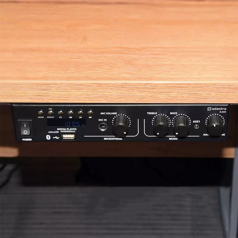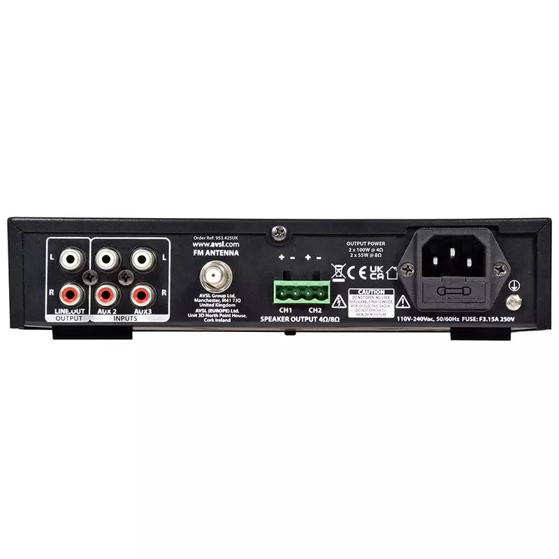 Digital stereo PA amplifier with integral media player and a class-D amplifier section delivering up to 2 x 100W max. output for background music with a microphone input for announcements or alerts. The media player section can select between USB / microSD mp3 player, FM tuner, Bluetooth receiver, 2 stereo line inputs (rear panel RCA) and another line input on the front panel (3.5mm). Playback can be controlled from the front panel or by the supplied I.R. remote control. Four mounting brackets are provided which enable the A200 to be fitted under a counter top or against a wall for discreet installation. Two A200 units may be mounted side-by-side into a 1U rack space, which can serve smaller peripheral zones in a larger PA installation. Combine with 2 or 4 speaker units for a truly space-saving sound system with comprehensive and easy-to-use functions. The A200 can deliver power that belies its compact dimensions, capable of powering larger background speakers up to medium-sized PA speakers.