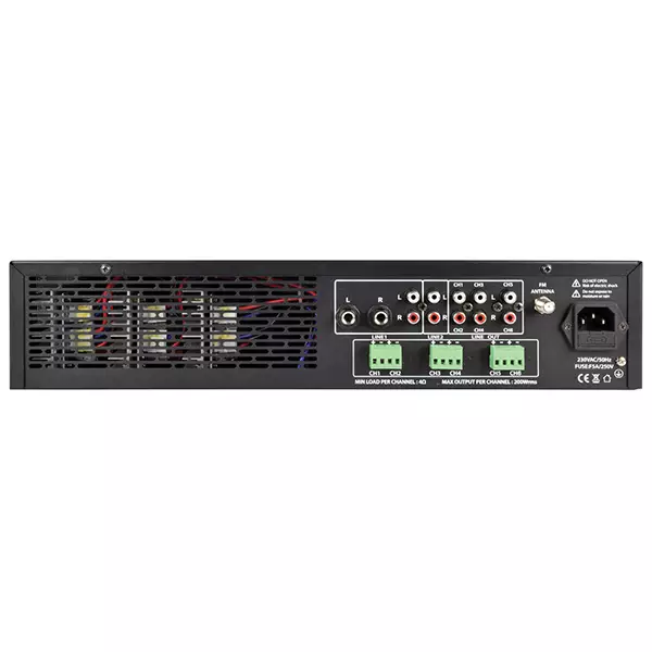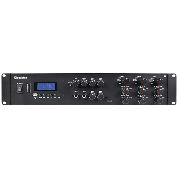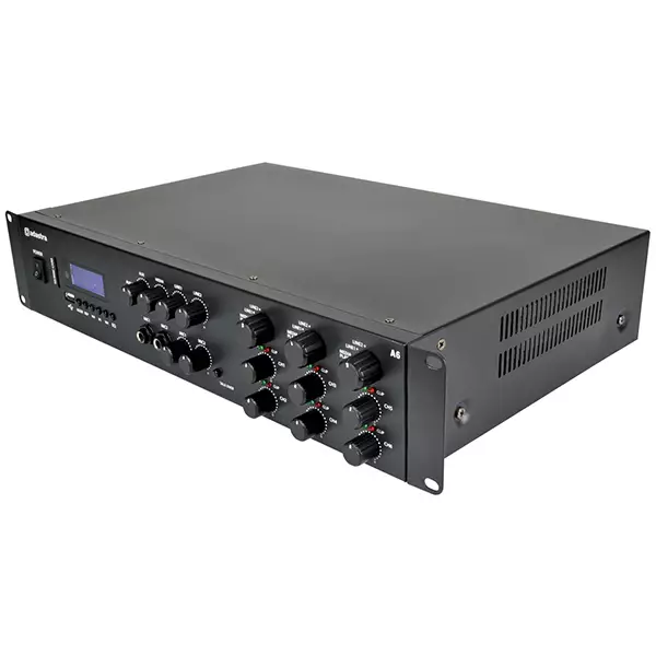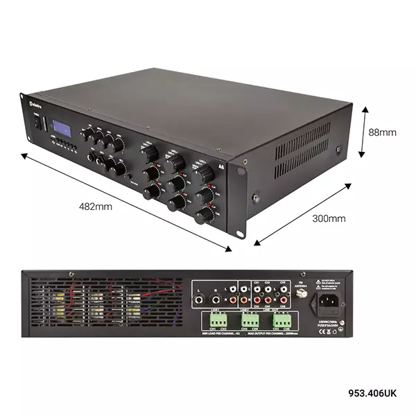 Multi-zone amplifiers with 2 microphone inputs and a switchable stereo input for each zone. An inbuilt media player section offers playback of mp3 audio tracks from USB drive or SD card and also has a B/T wireless receiver and FM radio tuner. A rotary switch for each output zone selects the stereo playback audio from a choice of 2 rear stereo inputs, a front 3.5mm stereo input or the built-in media player. Mic inputs 1 and 2 are live to all output zones at all times. Speakers are connected from the rear panel Euroblock terminals to deliver up to 200W per output at 4 Ohms. Designed for installations requiring high quality stereo sound in multiple rooms or listening areas.