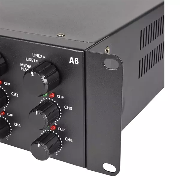- Output controls: 3 x source select, Ch1 – Ch6 level