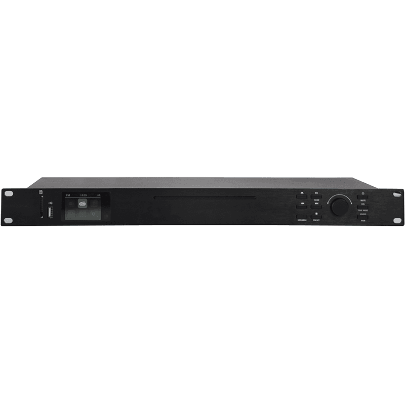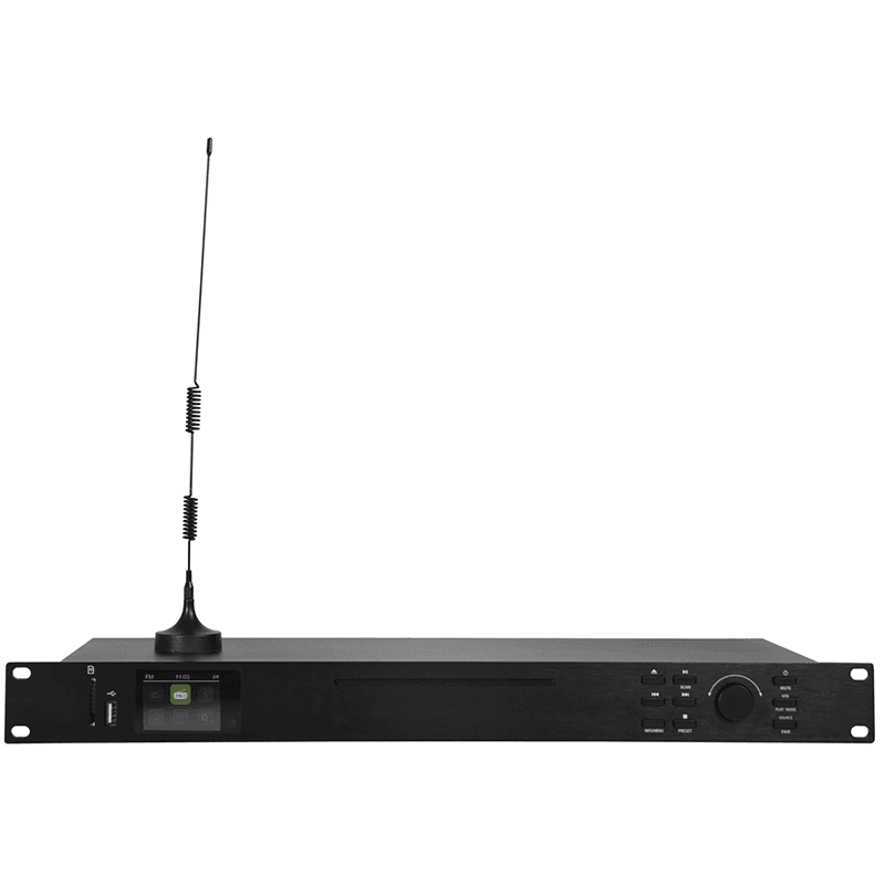 1U rack-mountable audio source with 6 different playback modes all in a single, compact unit. The clean and minimalist front panel is home to a full colour TFT display, which shows mode and settings information (including a clock in standby mode). Controls on the right side of the front panel operate the menus and playback, along with the included remote control handset. Modes include a slot-feed CD player, USB player, SD card player, FM tuner, DAB/DAB+ tuner and Bluetooth® receiver. A compact magnetic spring antenna is provided for FM and DAB+ reception which connects to an F socket on the AS-6 rear panel, or alternatively connect this socket to a roof mounted aerial for best possible reception. A comprehensive solution for playback in any sound system installation requiring background music and other continuous program material.