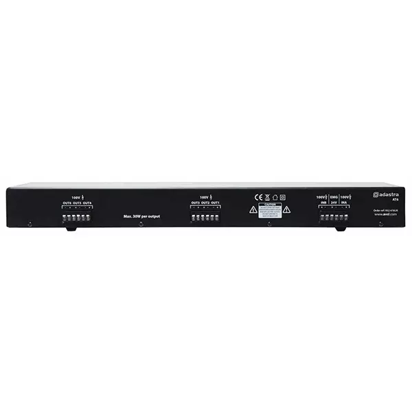 Connect an AT6 to one or two 100V amplifiers to provide a 6-zone volume and source solution for multi-room installations. Housed in a 1U rackmount enclosure, the AT6 has six output channels, which can feed up to 30W to one or more 100V speakers. Each channel has a rotary volume switch, on/off switch and an A/B source switch. When connecting 2 amplifier outputs to the AT6, one amplifier becomes input A and the other input B, so that each channel can have an independent choice of audio source and output level. 24V terminals can be connected to an emergency control panel for global muting. A completely passive and cost-effective add-on to convert single output amplifiers into a flexible zoning system.