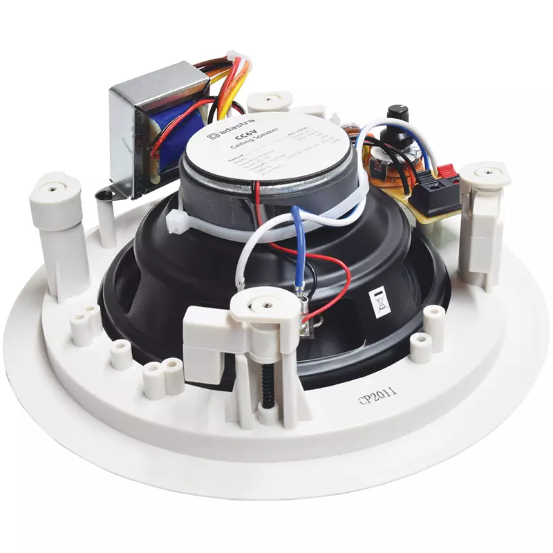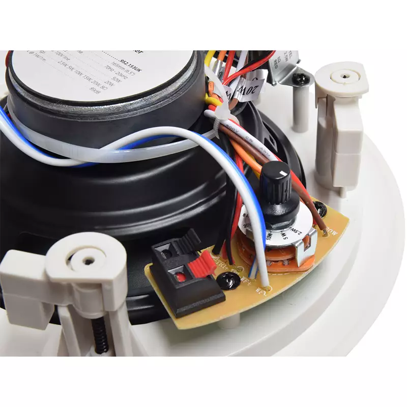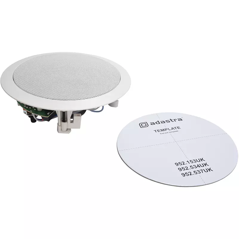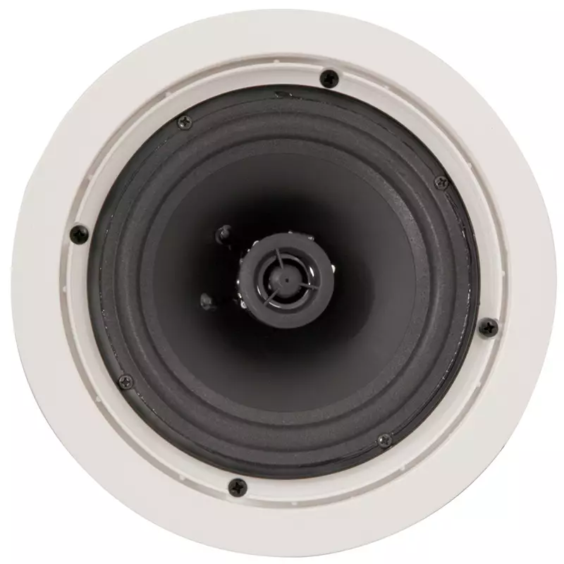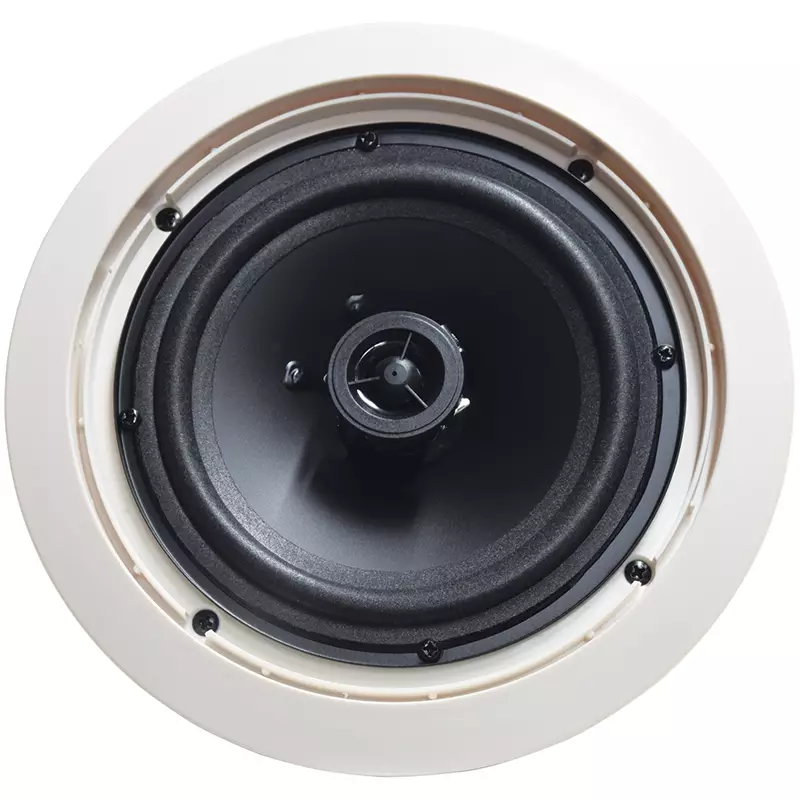 2-way quick fit ceiling speakers with PP mica bass driver and directional dome tweeter giving an excellent frequency response, all housed in a white polymer frame with metal grille.
