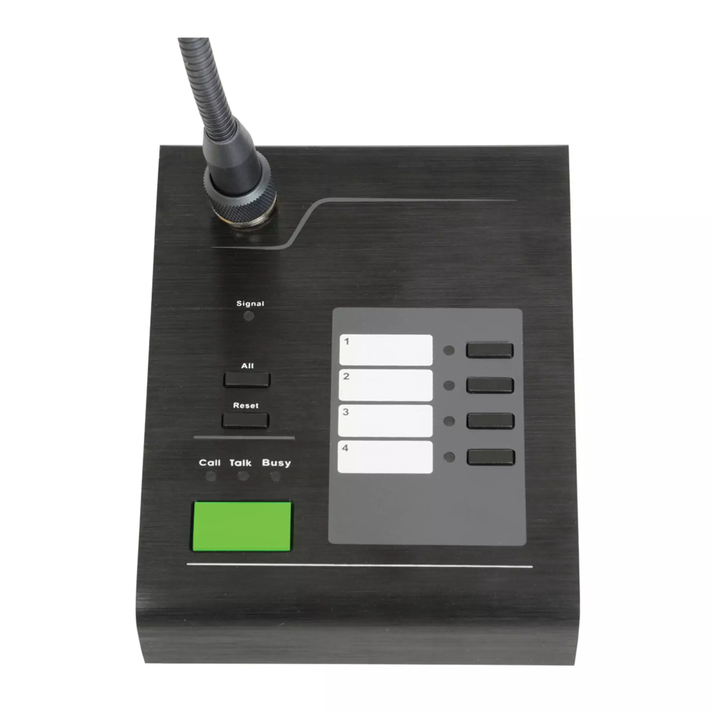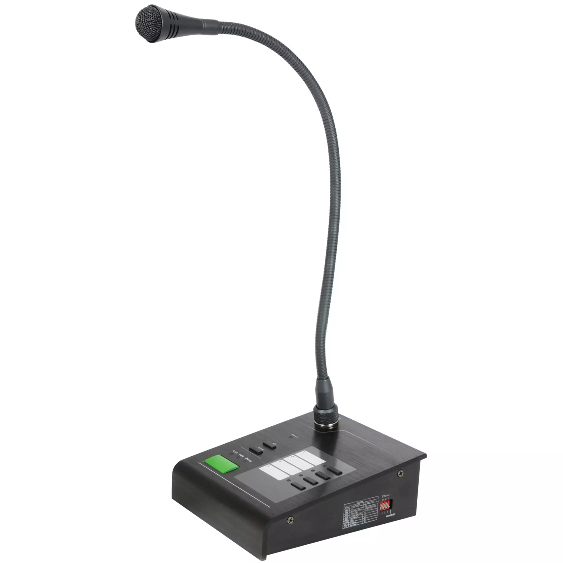 Paging microphone with call station base for use with the RM244V mixer-amp. Connected via RJ45 for both signal and power to simplify wiring. Zone assign buttons enable calling to one or all zones. Pressing the page button mutes all audio playback and plays one of 8 selectable chimes, opening the microphone to the selected zone(s). Pressing the reset button mutes the microphone and resumes background music playback to all zones. This system offers 4-zone paging without the additional cost of using a quad amplifier.