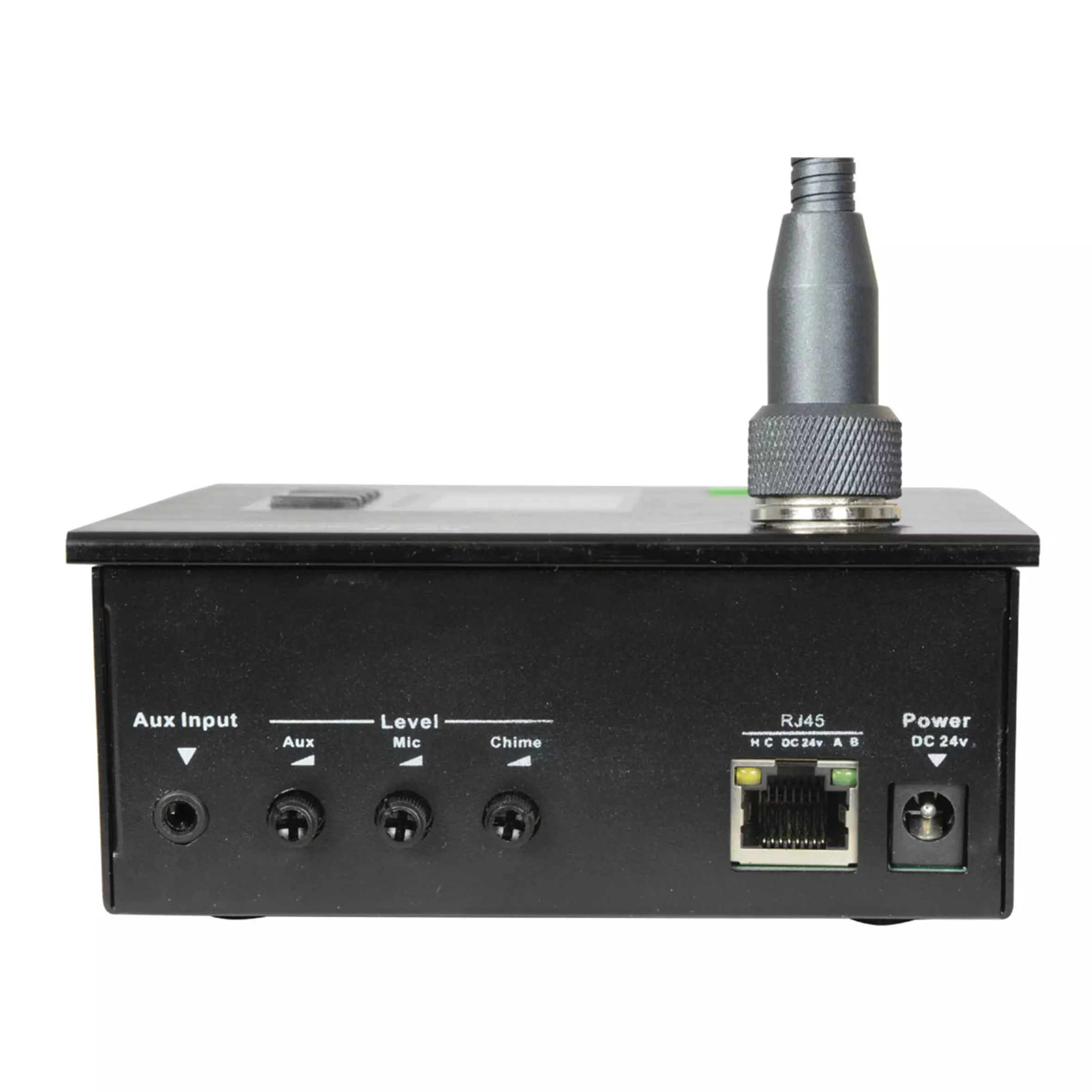 • Connectors: RJ45 to amplifier, 24Vdc power jack, 3.5mm aux in
