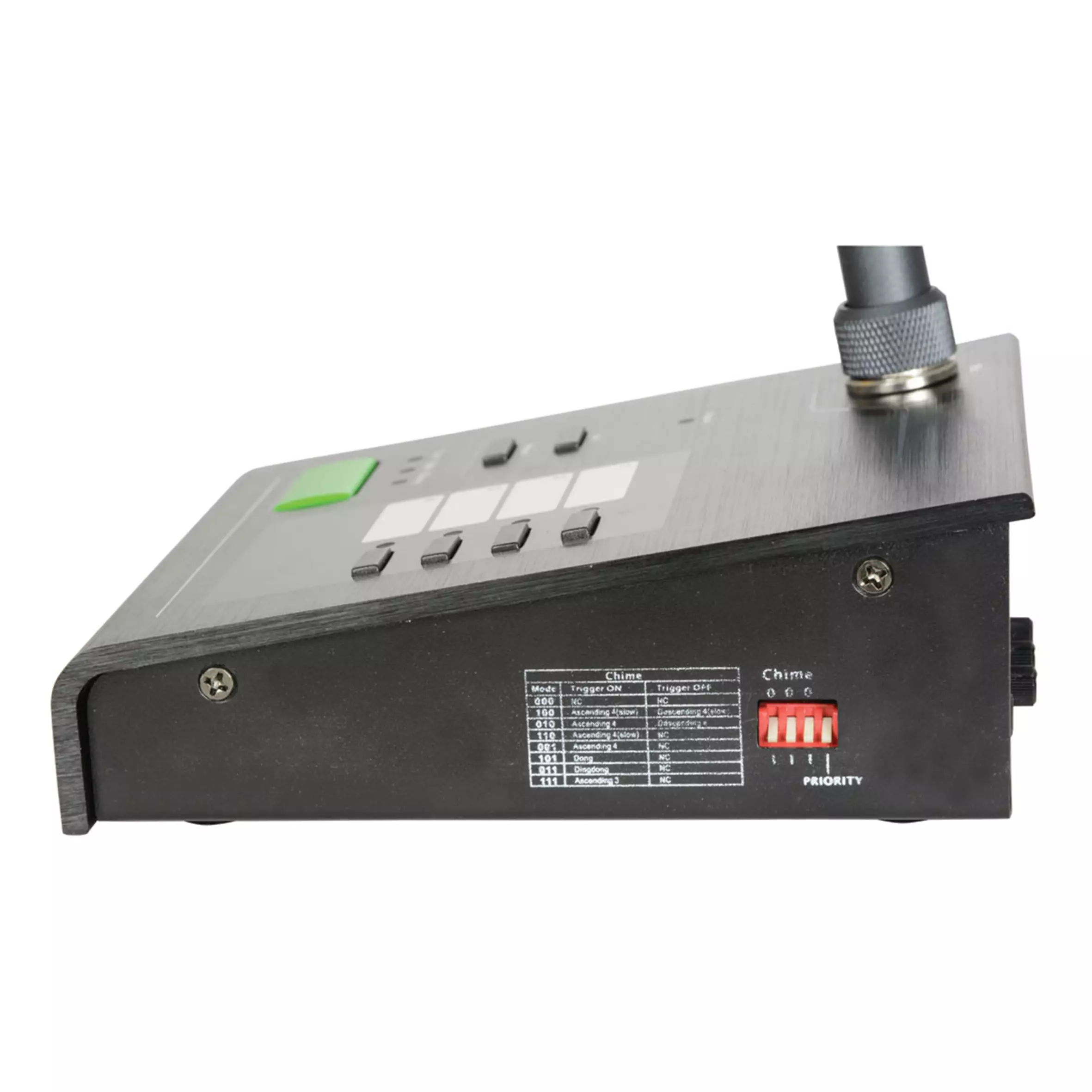 • Controls: Aux/Mic/Chime levels, chime DIP switches, zone/page buttons