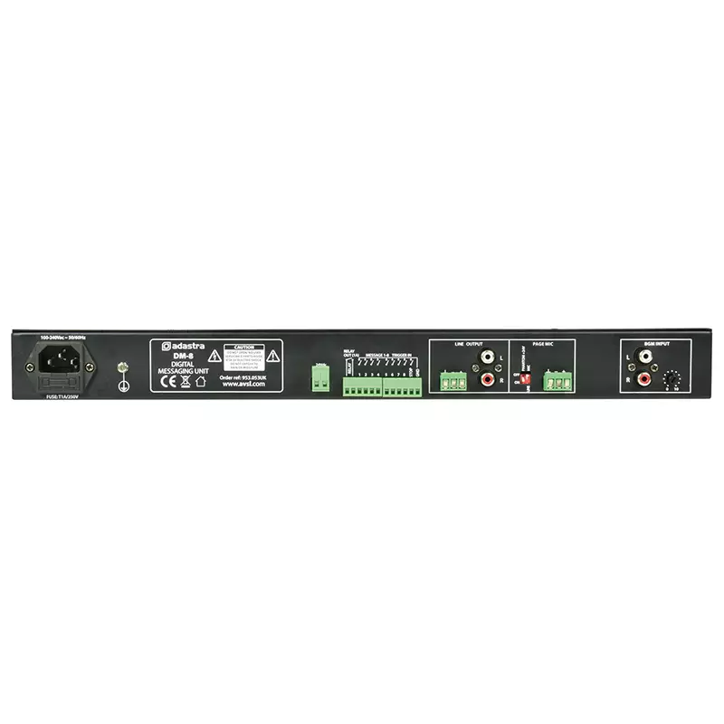 1U rack-mount digital messaging unit for scheduled audio playback. Audio files are stored on a removable SD card and may be transferred by inserting into a PC or directly recorded on the DM-8. Schedules are also stored on the SD media as a separate file, which can be edited with a PC and stored for backup. Separate SD cards may be saved with different audio messages and schedules and swapped for different routines. A mic/line input can be used for recording or for live announcements which can override SD playback. A BGM line input is provided for background music playback with its own level control and is muted when messages are playing or during paging. Up to 99 schedules can be programmed to play a particular audio file from the SD card, set by 24 hour time and day(s) of the week. The DM-8 can be added to any sound system to provide automated playback of timed announcements, music or audio alerts.