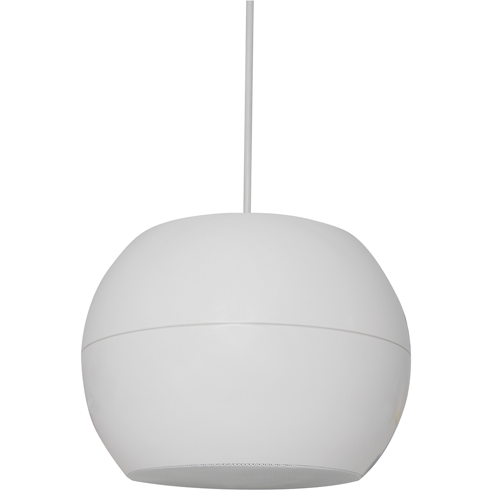 Wide dispersion spheroid 2-way pendant speakers for use with high ceilings where regular ceiling speakers would be positioned too high to be efficient. Each has a rotary switch on top for selecting 100V line tappings and 8 ohms operation.