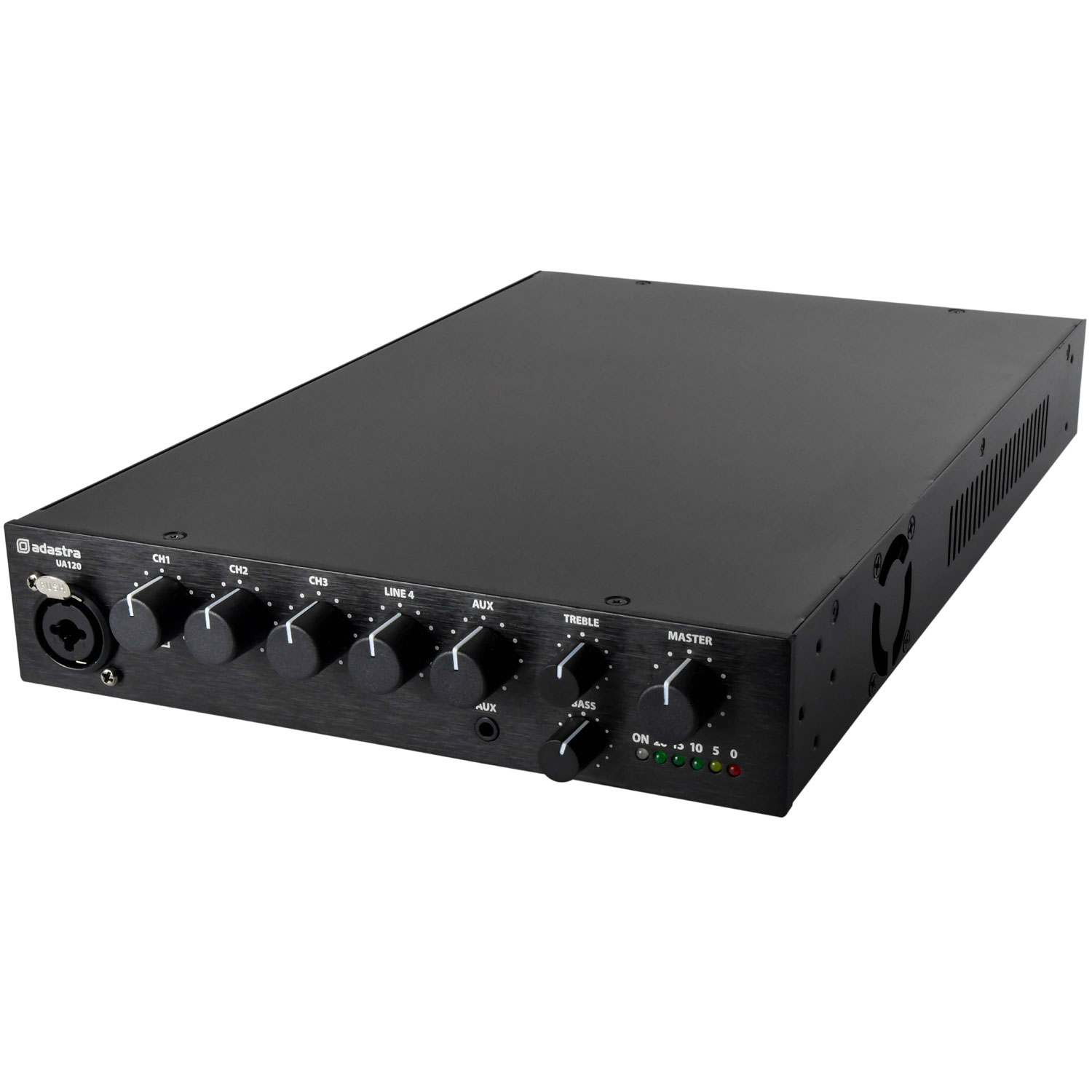 100V mixer-amplifiers with a 5-input mixer in a half width 1U housing. 3 switchable mic/line inputs, an RCA line input and a 3.5mm Aux input are governed by front panel volume controls and a Master output control. Mono output to either 100V line or 8 ohms speaker load is connected via a removable screw terminal connector on the rear panel. Supplied with rack-mounting hardware which can be configured to mount a single unit against a wall or under a worktop. Designed as a versatile solution for small to medium PA installations.