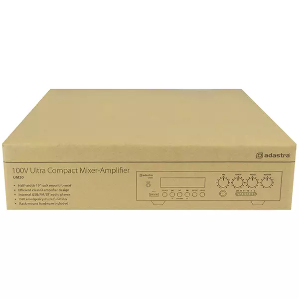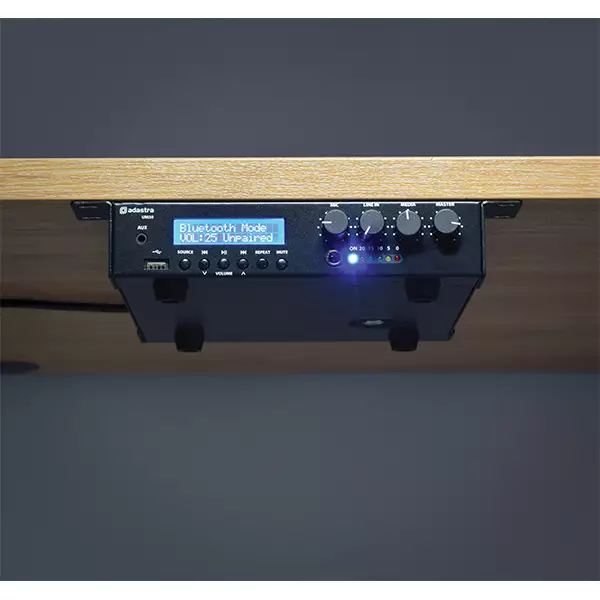100V mixer-amplifiers with USB audio player, FM tuner and BT wireless receiver in an ultra compact housing. Microphone input, line input and USB/FM/BT sections are governed by front panel volume controls and a master volume. Mono output to either 100V line or 8 Ohms speaker load is connected via screw terminals on the rear panel. Supplied with hardware for mounting 2 units side by side in a 1U 19″ rack space. Designed as a versatile solution for small to medium PA installations.