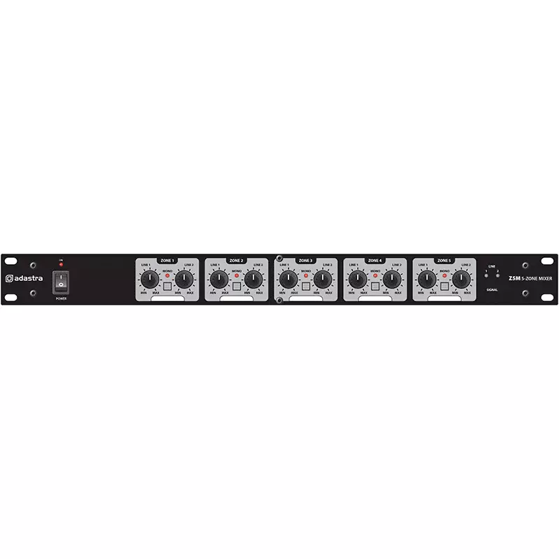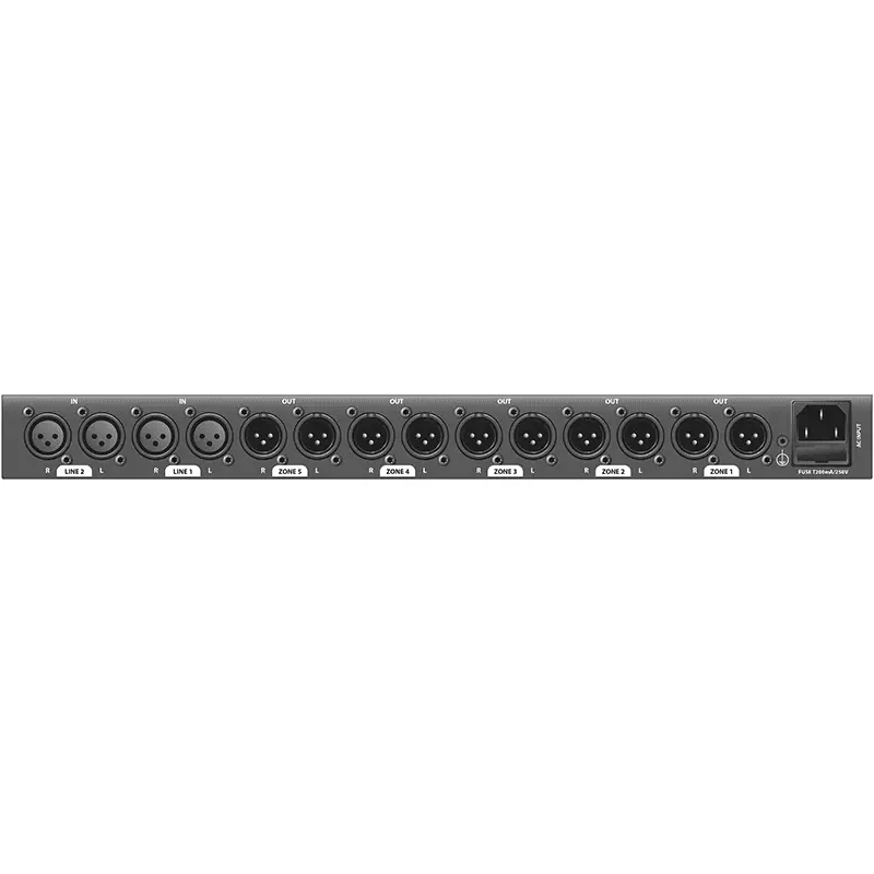 2 input, 5 zone mixer with individual volumes for both inputs and a mono switch for each zone. All inputs and outputs are stereo via balanced XLR connectors. Acts as the central mix and control in an installation serving up to 5 separate stereo speaker zones.