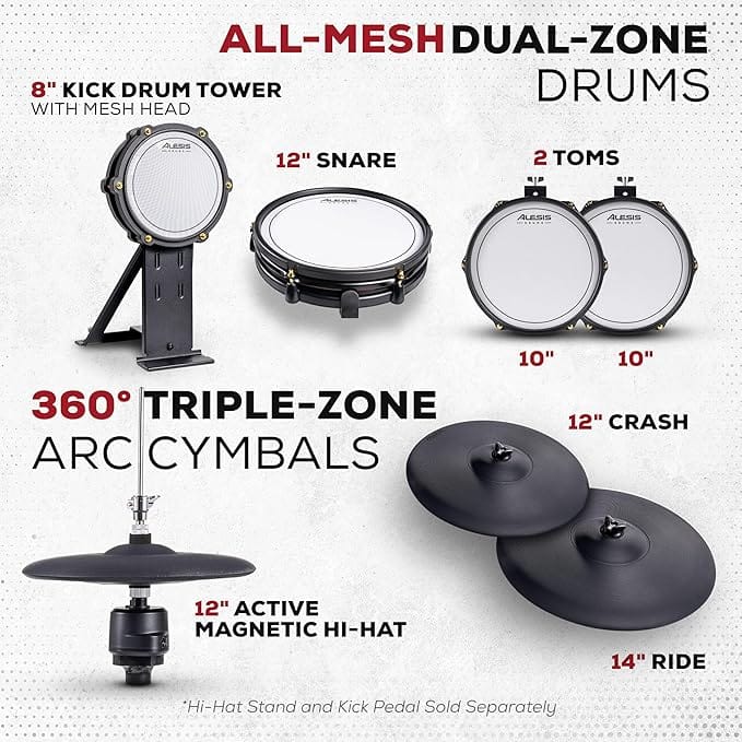 • Level Up Your Acoustic Drum Set – All mesh dual-zone drums plus 360° ARC triple-zone cymbals (12″ crash; 14″ ride) and 12″ hi-hat come ready to integrate e-kit technology into your existing setup