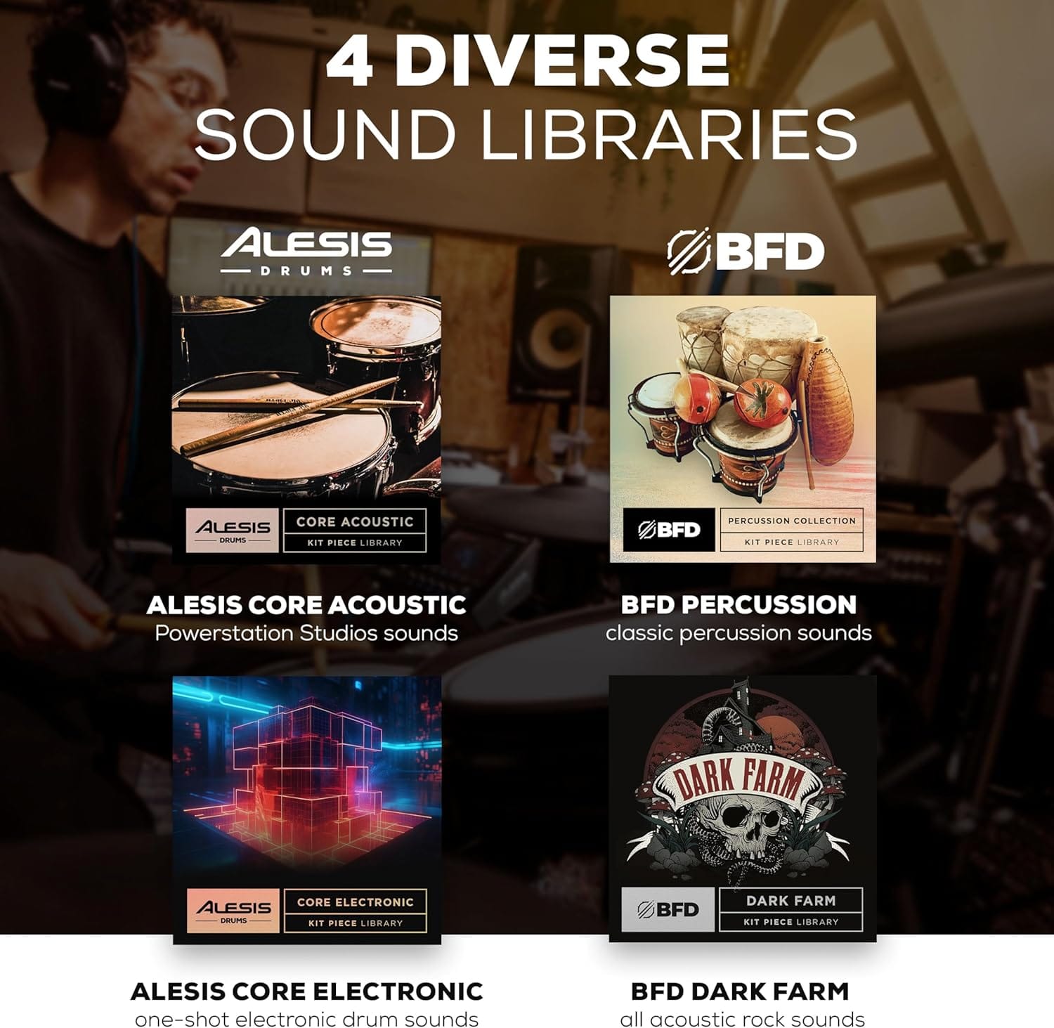 • Diverse Sound Collections – Includes 4 libraries – Alesis Core Acoustic, BFD Dark Farm, Alesis Core Electronic and BFD Percussion; multi-layered factory content to top up the 75 factory kits