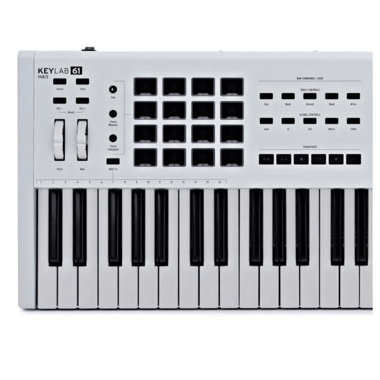 A gateway to software, the KeyLab 61 MkII features 9 rotary encoders, 9 faders, 16 backlit RGB performance pads, and a selection of fully assignable buttons to give you unfettered access to your virtual instruments, effects, and recording environment.