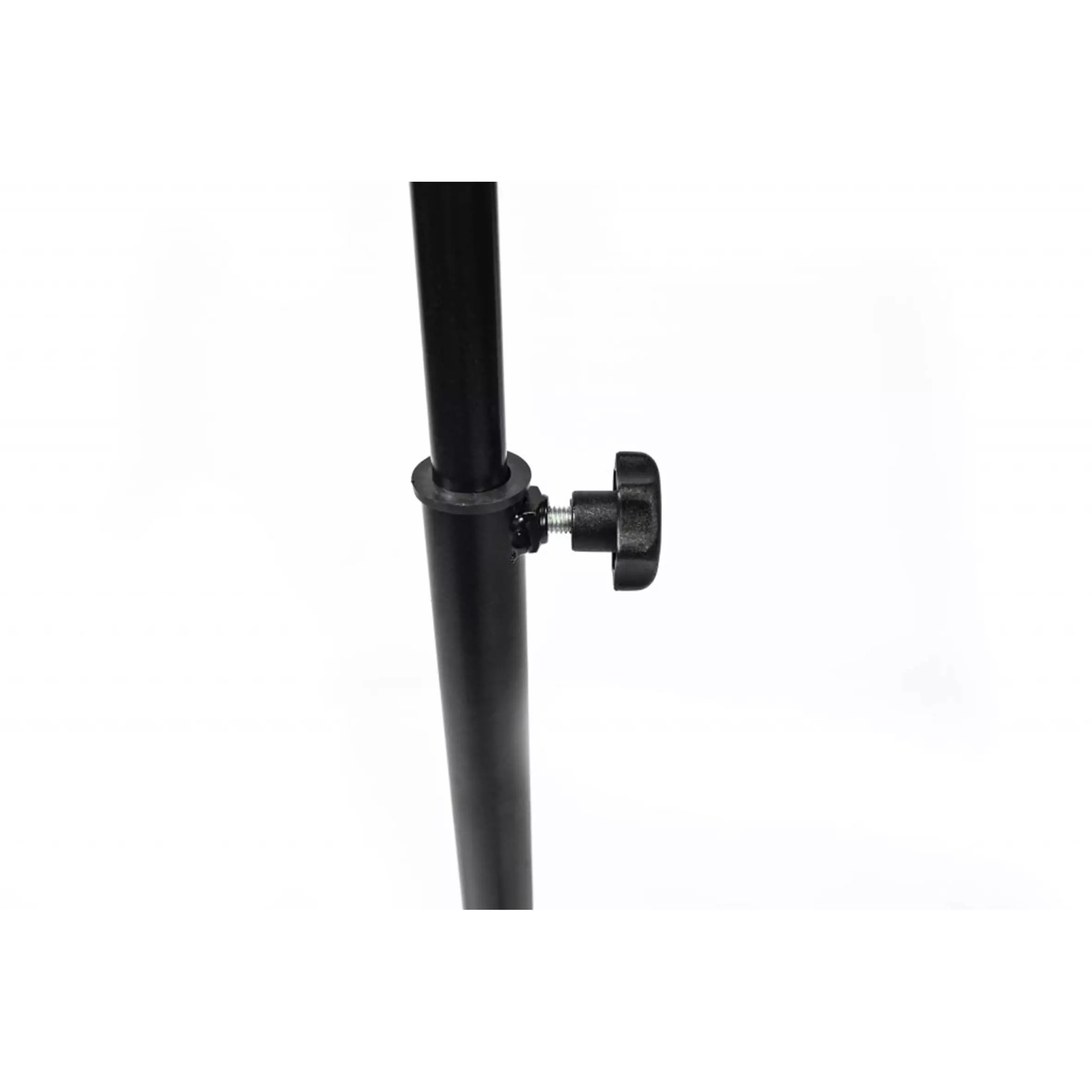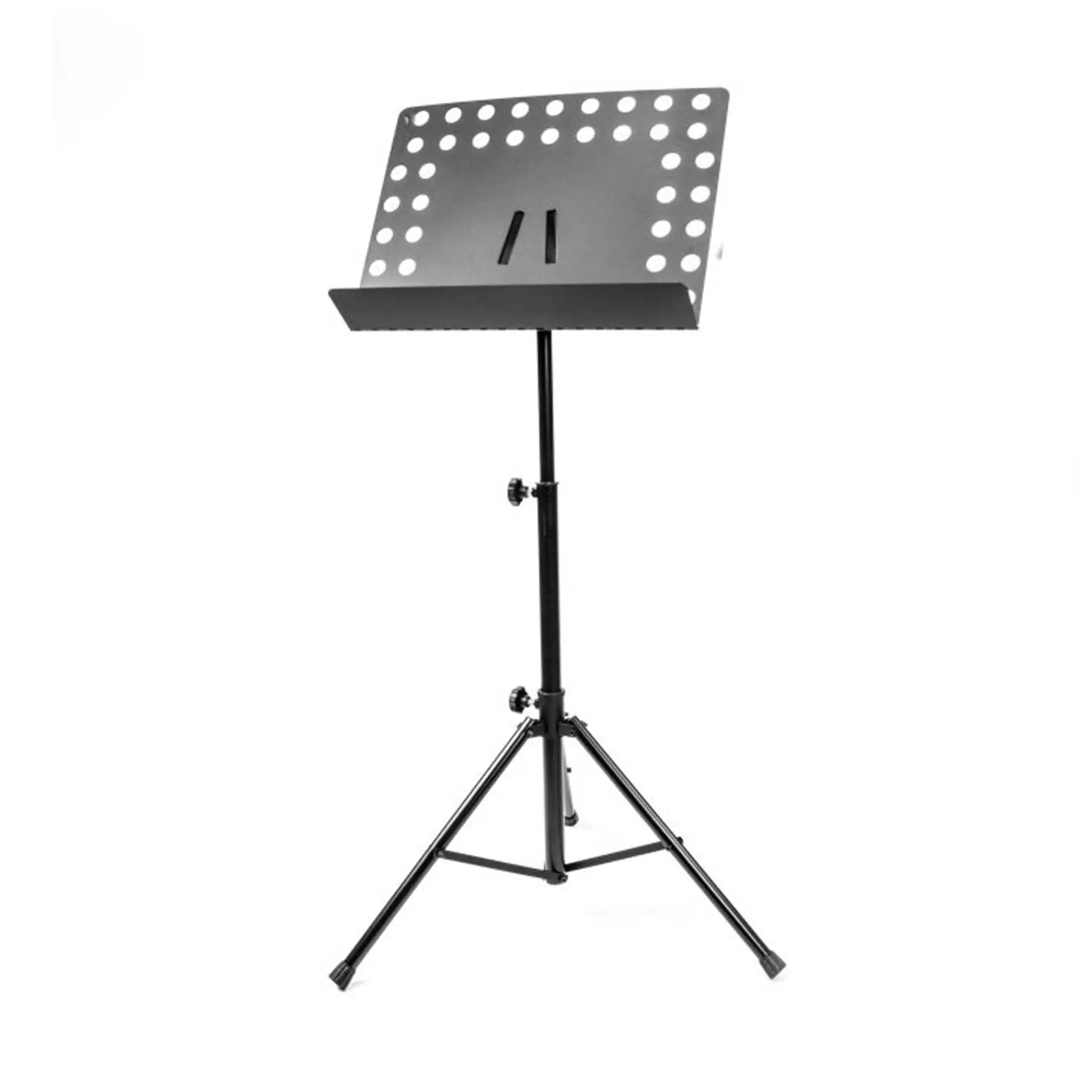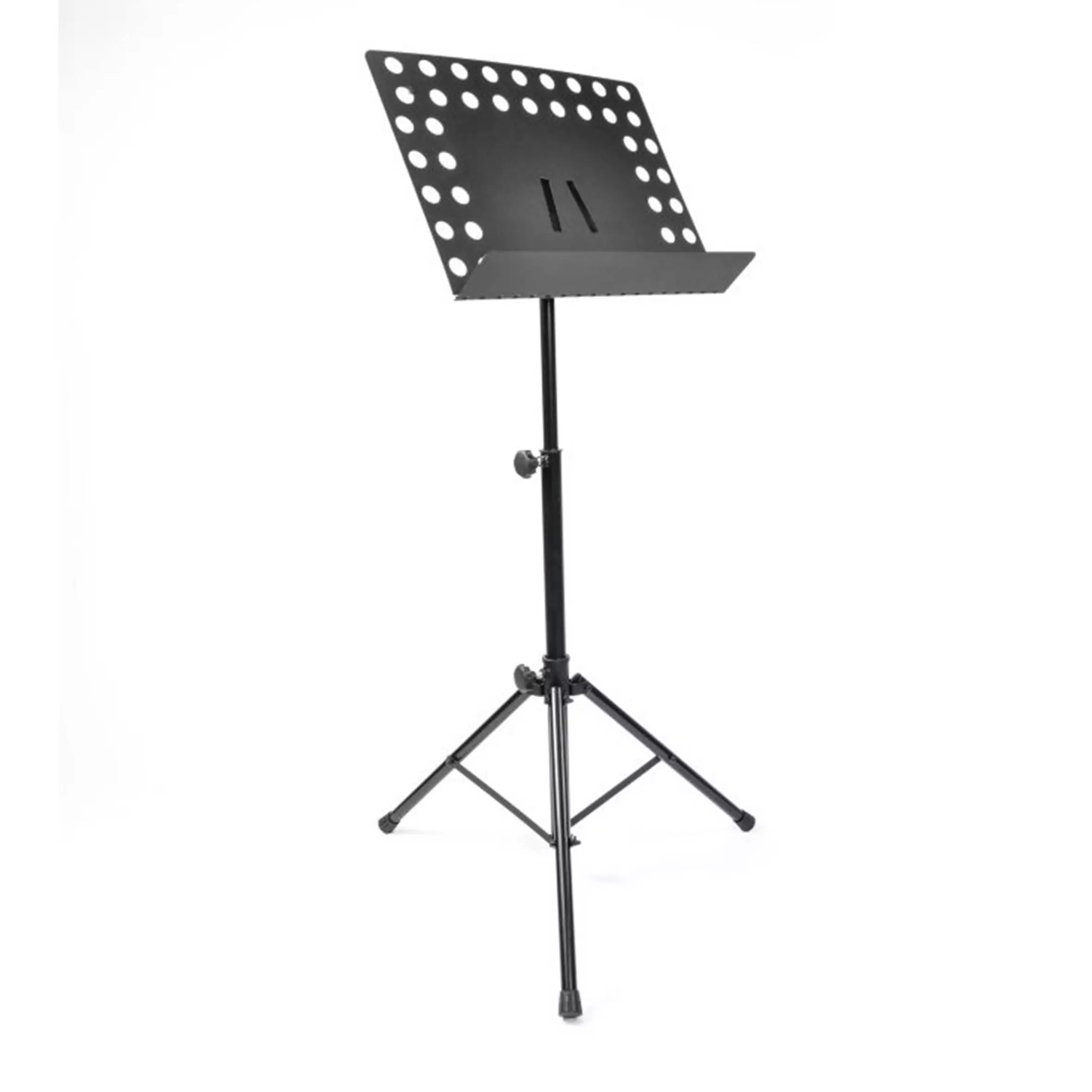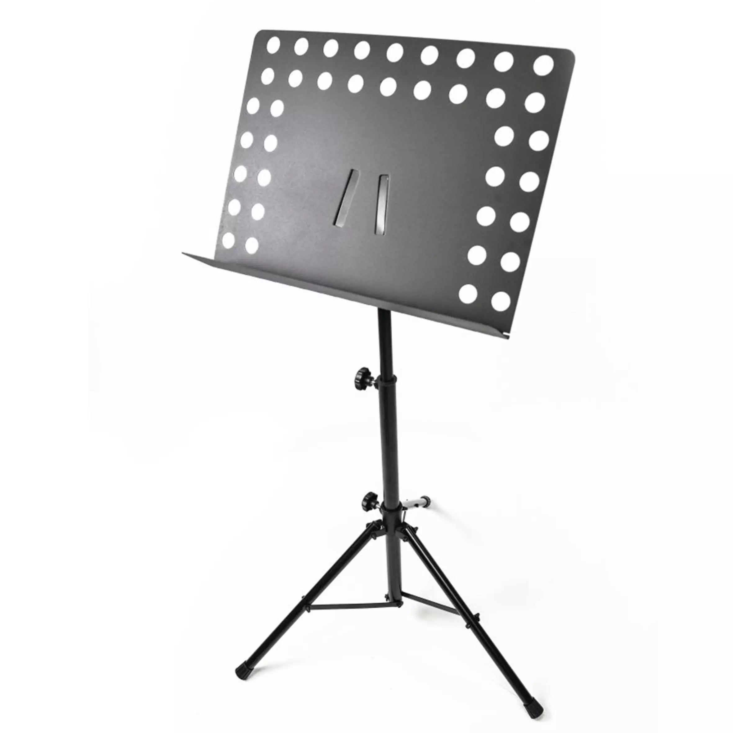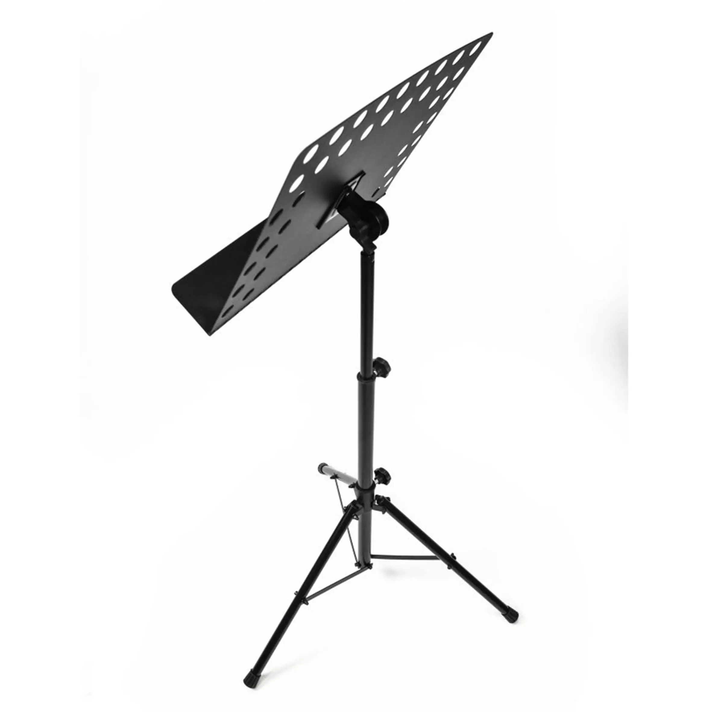 A high quality, professional music stand mounted on a metal tripod, featuring stepless height adjustment and a folded top made of steel.