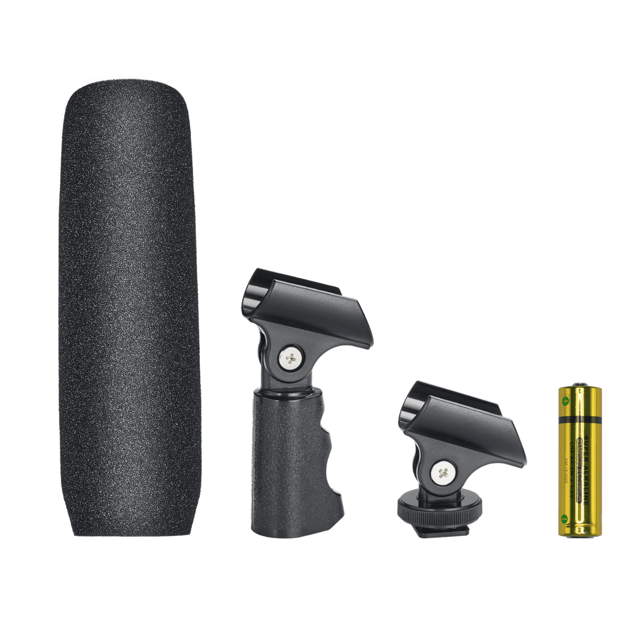 - Includes camera mount, stand clamp, foam windscreen, and AA battery