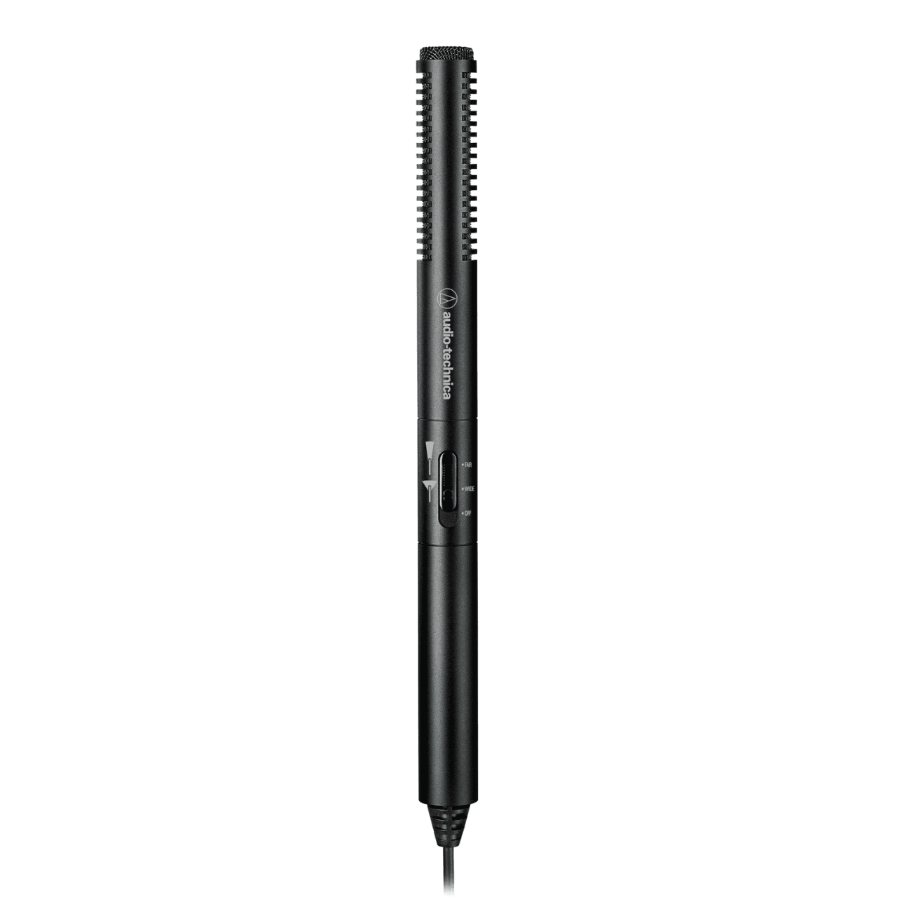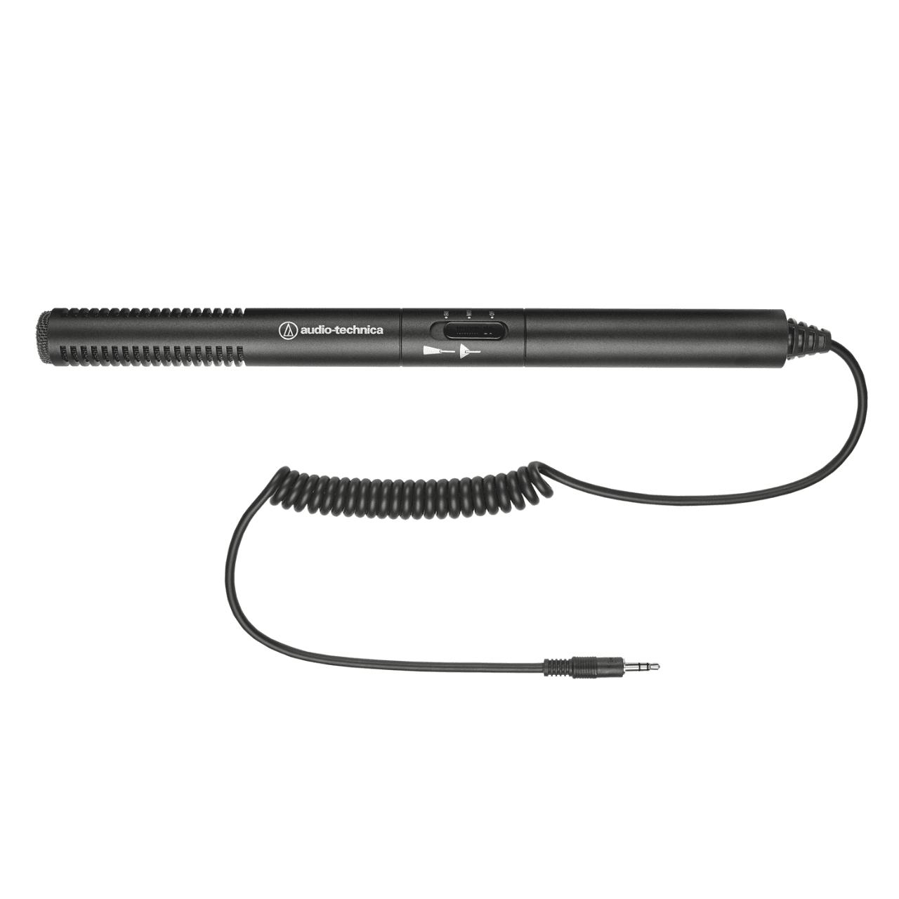 The ATR6550 shotgun microphone offers crisp, intelligible pickup from close or far away. A switch on the microphone’s body allows you to shift easily between “Wide” and “Far” settings. In the “Wide” setting, which is appropriate for close and medium-range miking, the ATR6550 functions as a standard cardioid condenser, focusing pickup on your desired sound source, while blocking noise from the rear and sides. Switching to the “Far” setting causes the polar pattern to narrow to supercardioid, giving you even greater directionality to pick up sound from a distance, while bypassing ambient noise such as traffic, air-handling systems, room reverberation and mechanically coupled vibrations. Designed especially for use with cameras, the ATR6550 comes with a camera shoe mount and has a permanently attached cable that plugs into a camera’s 3.5 mm (1/8″) mic input. Additional accessories include a microphone stand clamp, foam windscreen, and AA battery.