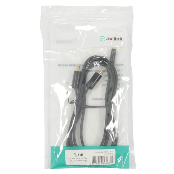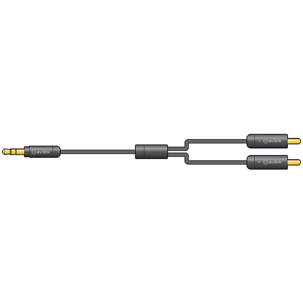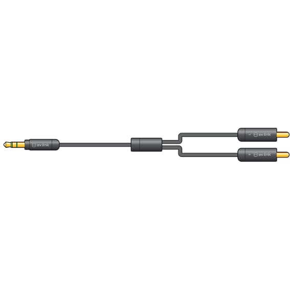 3.5mm stereo jack to two RCA plugs audio lead with slimline metal body for connecting mobile phones or personal audio players to RCA line inputs.