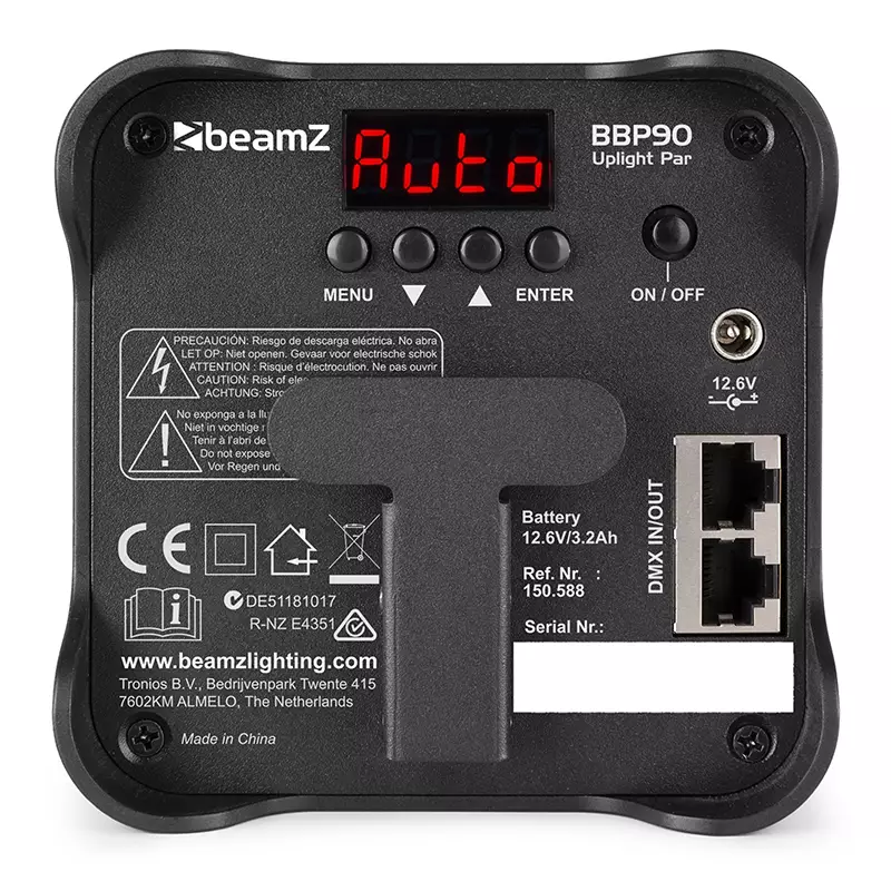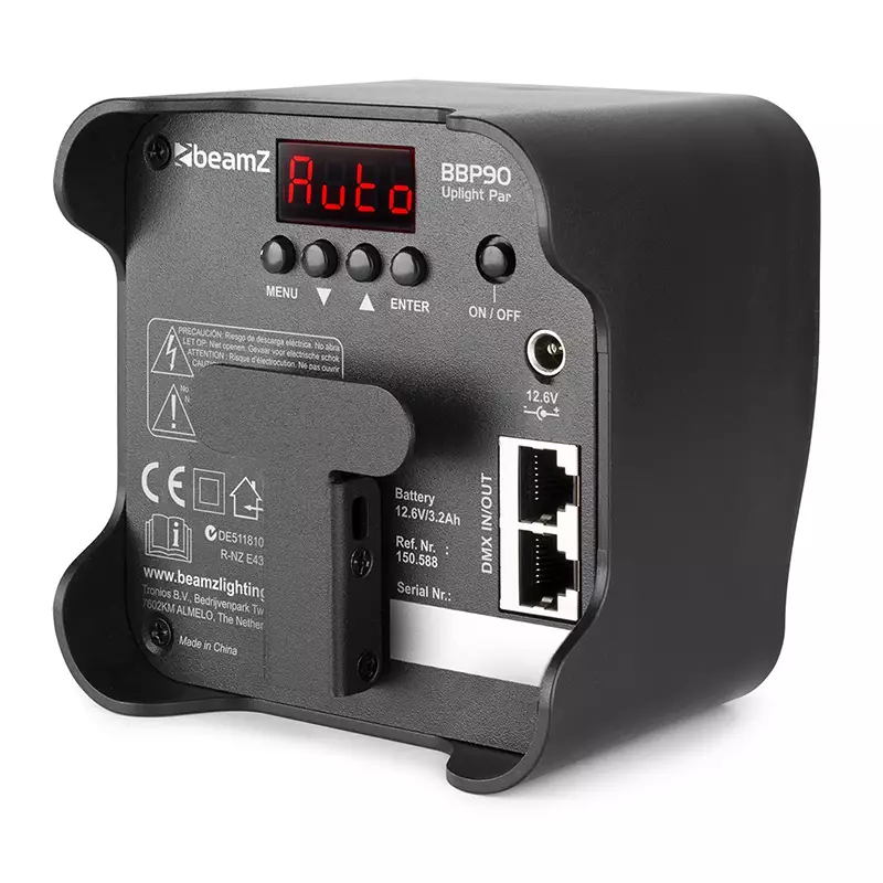 The BBP90 battery powered LED uplight is perfect for truss wash and other feature effects where access to power is limited. It’s equipped with 4x 4W high efficiency RGB-UV LEDs to create bright, intense and saturated colours and can be controlled through DMX, remote control or manual mode selection. Each charge lasts up to 20 hours (1 colour) from a single charge. The adjustable foot can be fixed in different angles for angular placement of the fixture. Extremely silent, no fan!