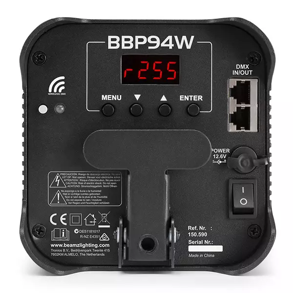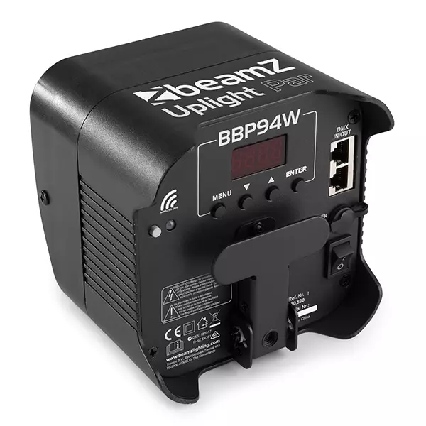 The BBP94W is a battery operated par ideal for use as an uplighter. The BBP94W comes fitted with an 8Ah battery which will last over 9 hours when fully charged. The adjustable foot can be fixed in different angles for angular placement of the par. With built-in wireless-DMX receiver.