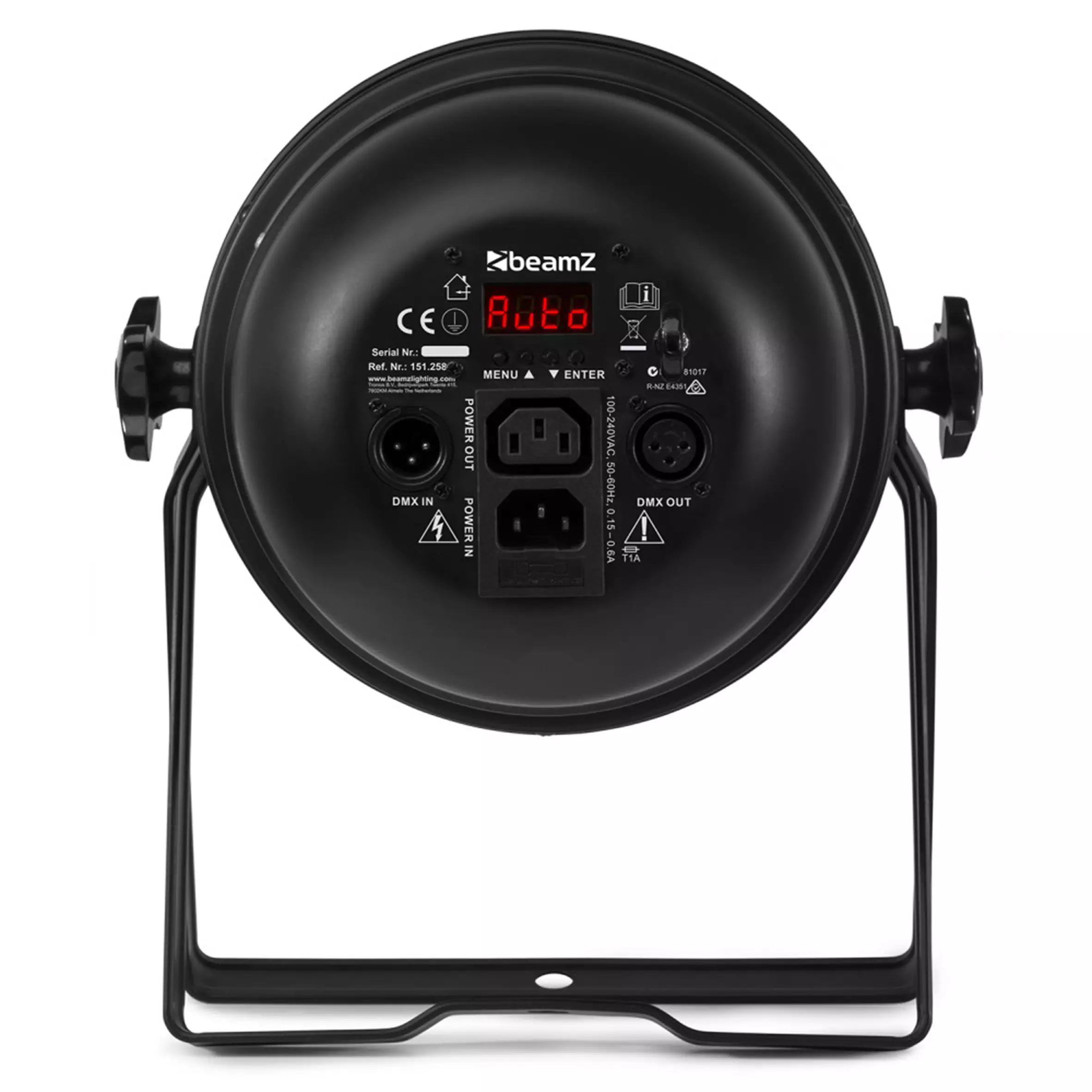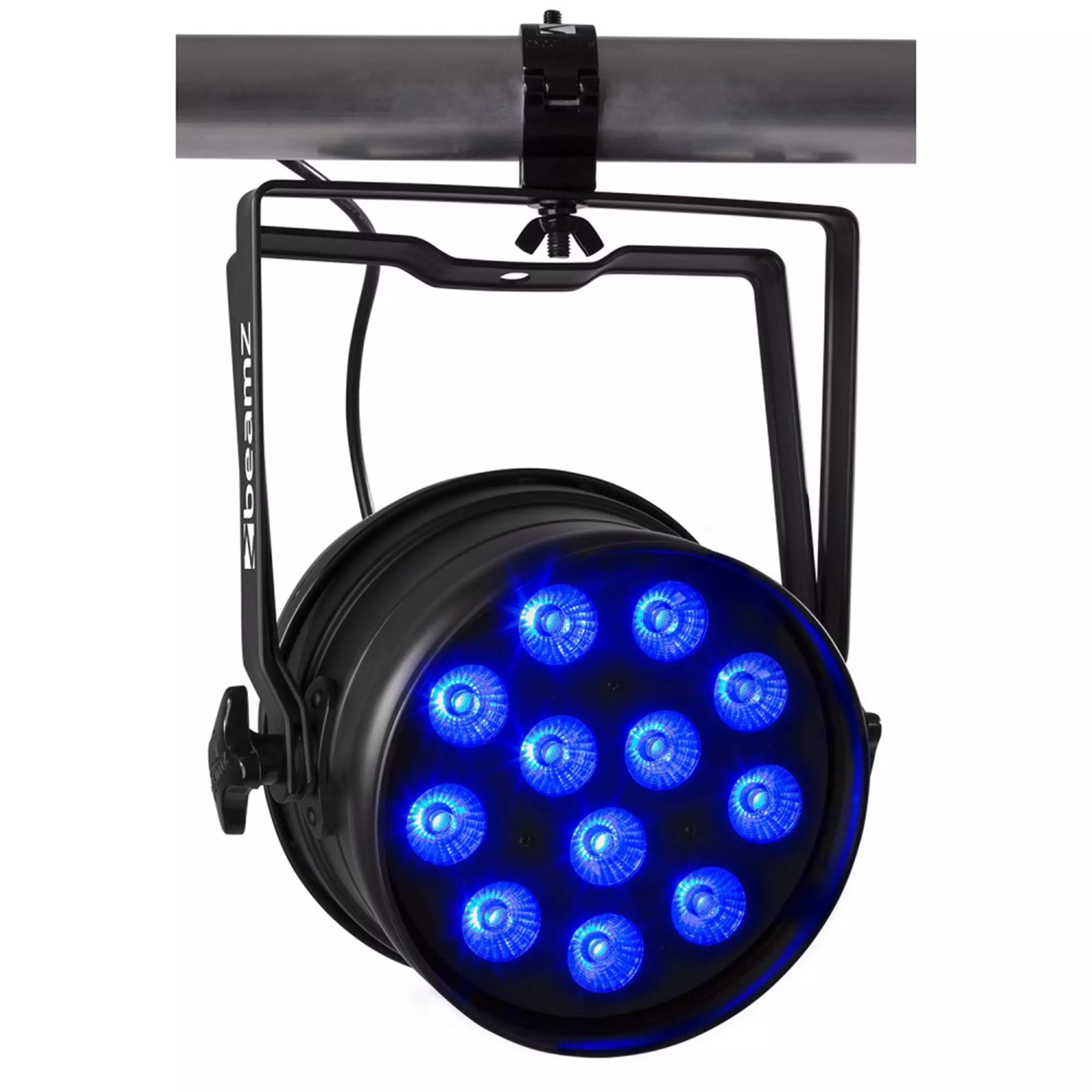 The BeamZ BPP120 LED Par 64 features 12x 3W RGB 3-in-1 LEDs with 25° wide angle lens for best colour mixing and a wide range of colour effects. These units have rugged housing and are equipped with a double bracket that also serves as a floor stand . The 4 push button LED menu allows for easy access to the functions including DMX, master/slave, sound activation and the stand alone function. The extra IEC output enables you to simply link the power of multiple units together into a single socket. There are no internal cooling fans in these PAR cans, which mean absolutely zero noise!