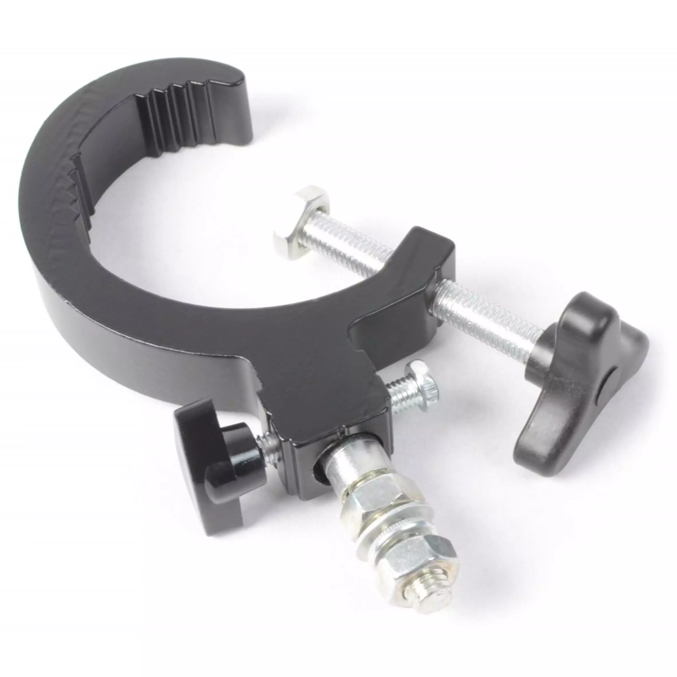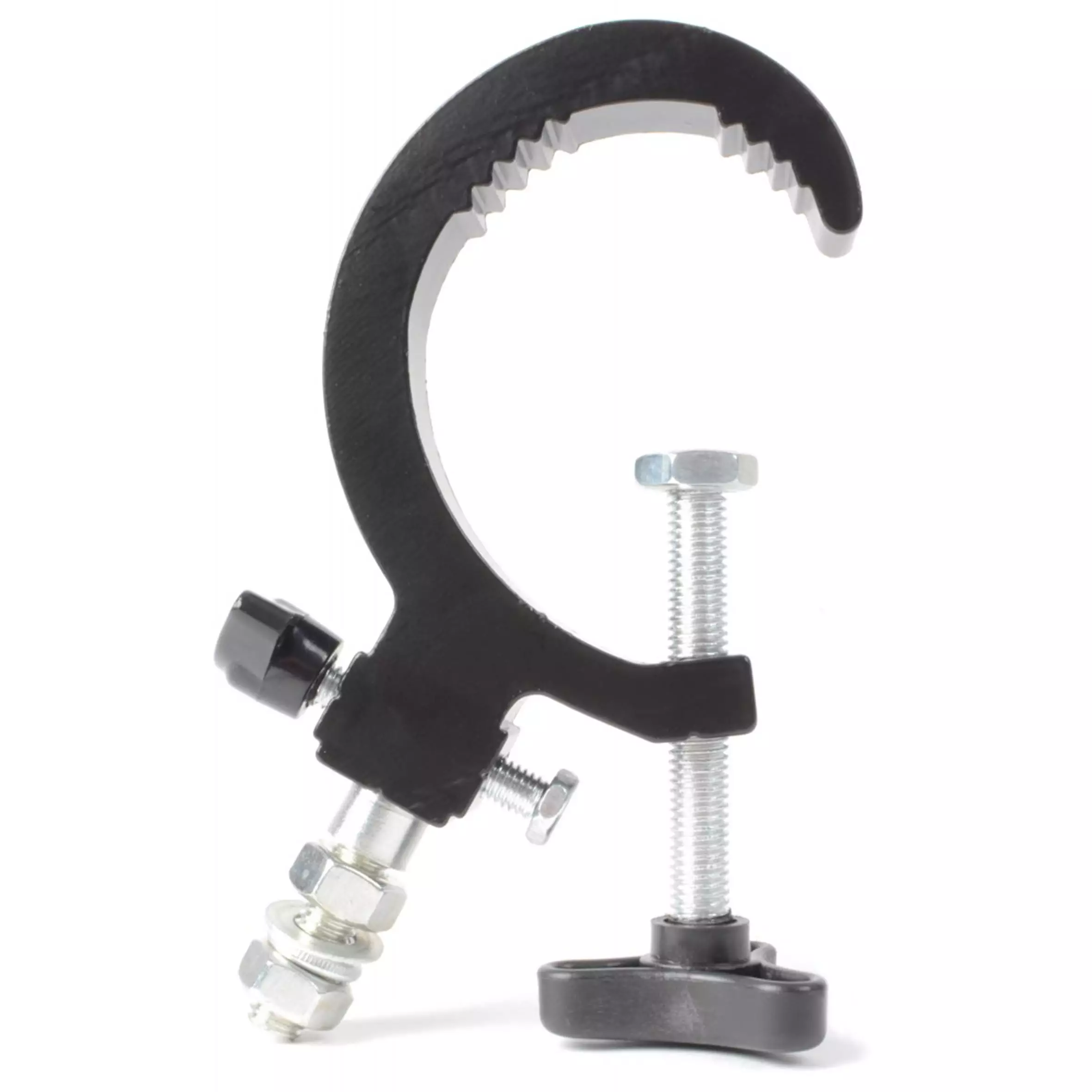 Special sturdy screw clamp for light effects. “G” shaped for universal applications. The “G” clamp can hold a maximum of 50kg in weight, perfect for almost any light unit. Fits on poles of 30-60mm diameter.