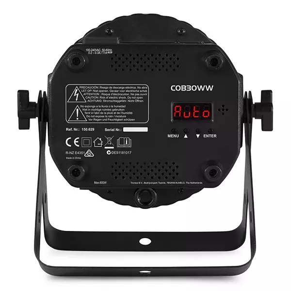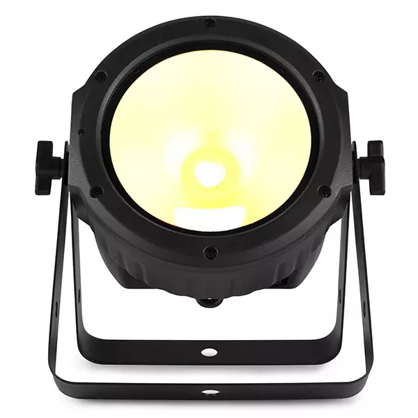 The COB30WW is a flat PAR equipped with a high power 30W COB (chip-on-board) LED and creates a 35° Beam Angle. The fixture offers a extreme highly intensity of warm white light and features built-in strobe and electronic dimming functions for use on the fly. The infra-red remote control simplifies operation and eliminates the bother of programming. Possibility of linking several units.