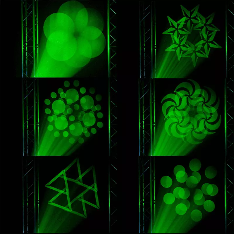 - Gobo Wheel: 5 rotatable gobos + open
