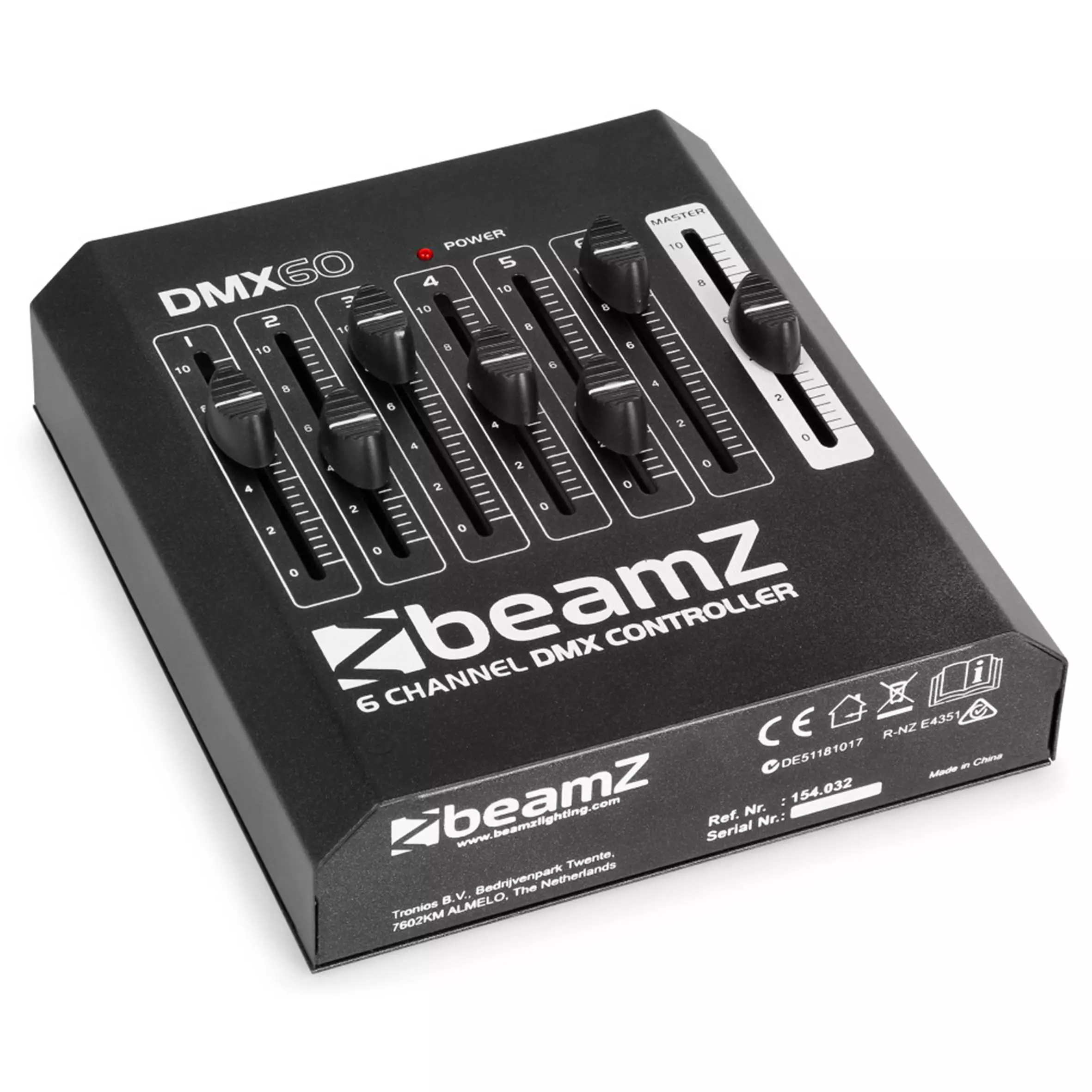A lighting console with six individual channels with faders controlling fixtures via DMX. Suitable for decorative lighting, zone lighting and using the master fader to dim the light in order to create a cozy atmosphere in occasions. Lightweight for easy use anywhere.
