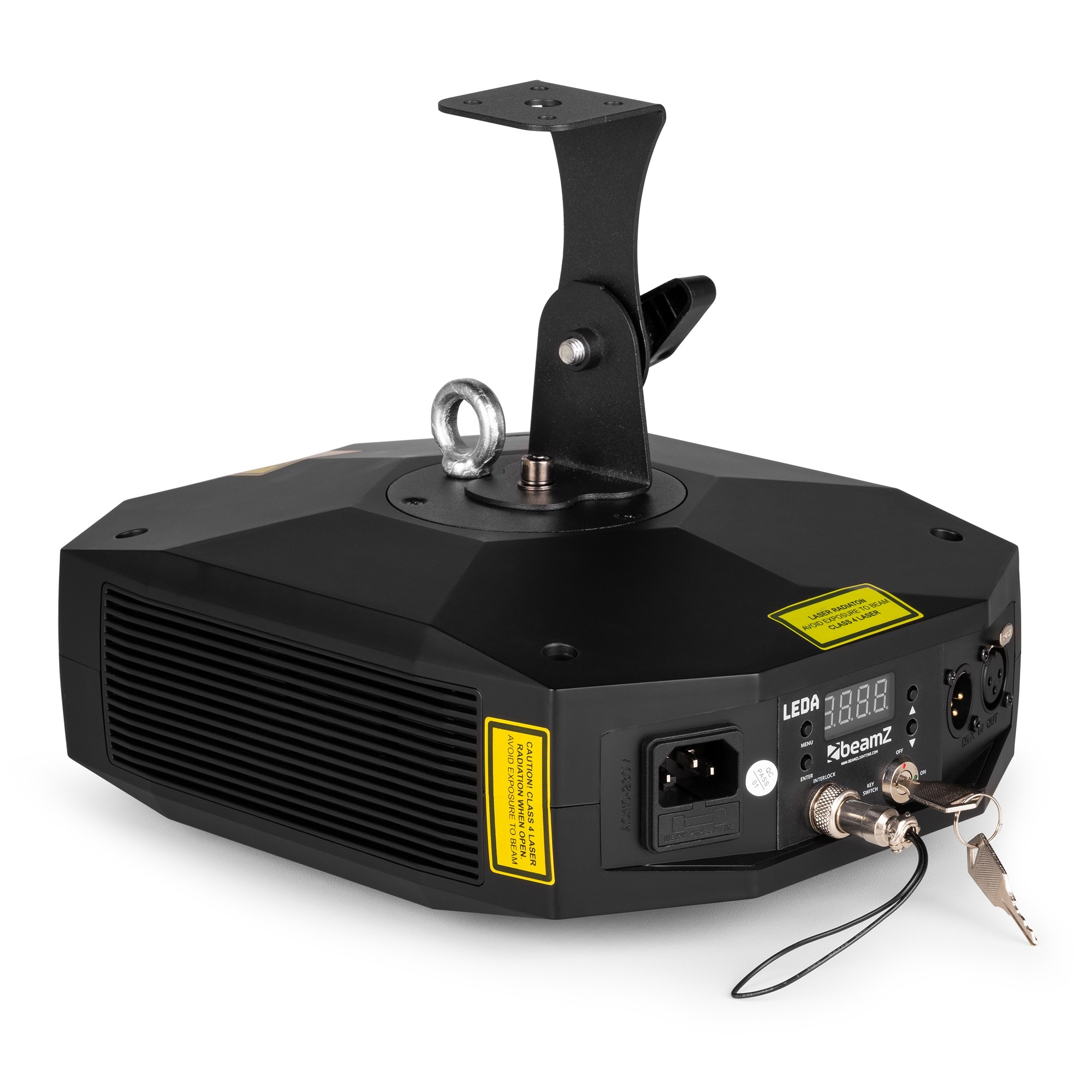 The Leda is an advanced DMX animation laser equipped with more than 100 integrated graphics, powerful beams and vivid animation effects. With its advanced RGB mixing capabilities, seven colours can be created at full intensity. The rear panel is equipped with a 3-pin DMX input and output for seamless integration of all types of DMX control units. When controlled via a DMX controller, the Leda offers the flexibility to choose between 7 or 16 DMX channels. Additionally, it can be set to a sound-activated mode thanks to its built-in microphone, allowing the laser to effortlessly synchronise with music.