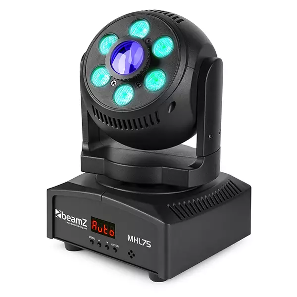 The MHL75 is a powerful hybrid moving head, consisting of a combination of Spot and Wash effects. This lightweight and compact moving head is packed with professional features that DJs, entertainers and other users can access via built-in controls or a DMX controller. Featuring six colours and seven gobos, this moving head will deliver a superb light show whether using sound activation, one of the built-in programs or controlling via a DMX controller. The MHL75 offers 16 channels of DMX control, a manual focus, 4-Button LED DMX menu, Electronic Dimming (0-100%) and advanced fine PAN/TILT. The combination of spot and wash produces a visual and mesmerizing experience of colour changes and patterns.