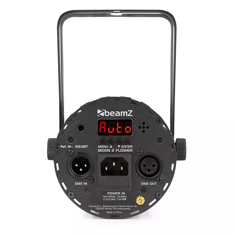 The Moon Flower 2.0 light effect is equipped with 72x 5mm LEDs for an astonishing light output. It operates very easy, you’ll only have to plug it in to a mains outlet and you’re ready to go. This compact light effect works completely stand-alone and is controlled by built-in automatic programs or sound control. For more dynamic effects there is also a 4 channel DMX mode that gives you more control over the use of the different colours and movements. The Moon Flower 2.0 is a perfect lighting effect for mobile DJ’s, live performances and all other mobile applications but can also be mounted in a fixed light plan for bowling areas, disco, club etc.