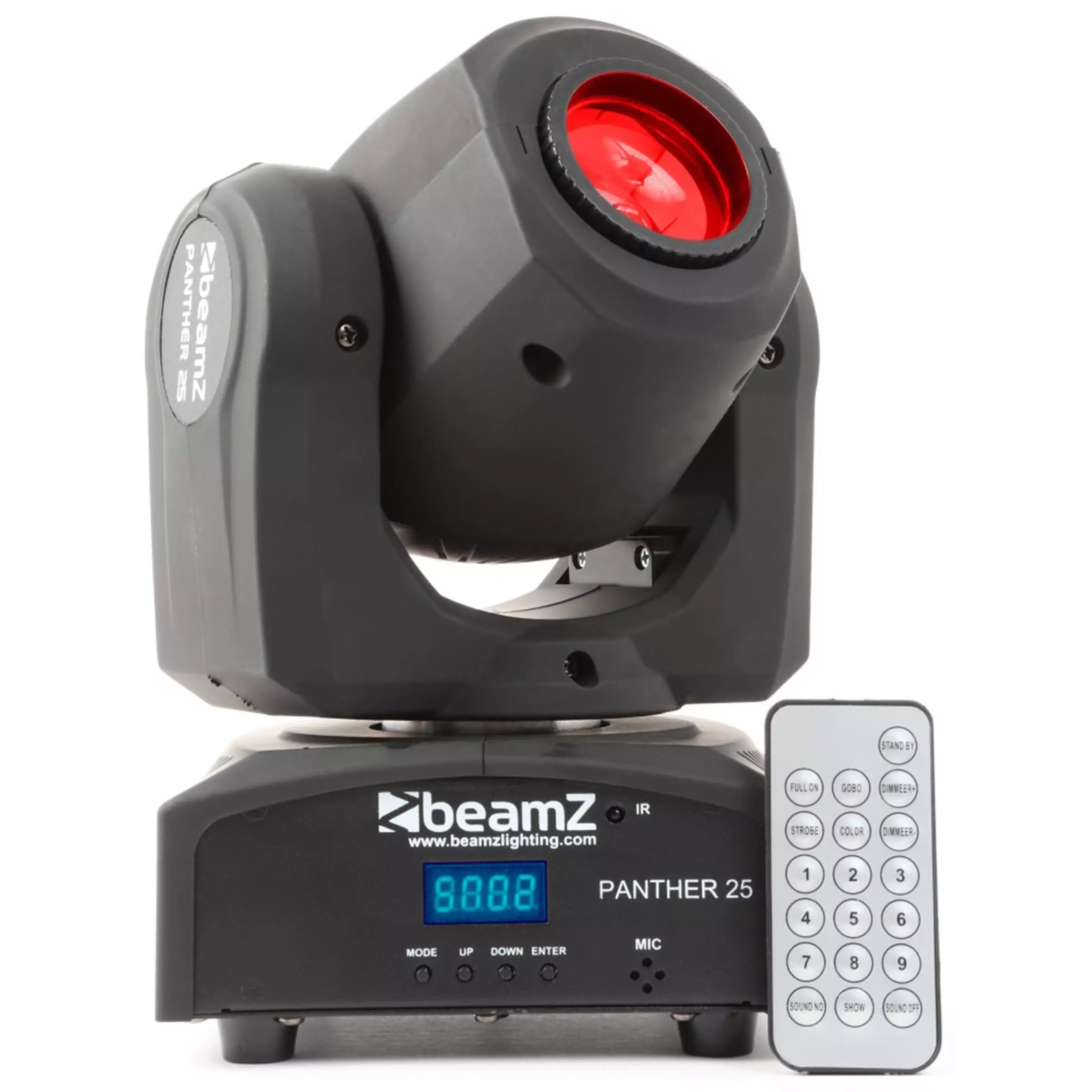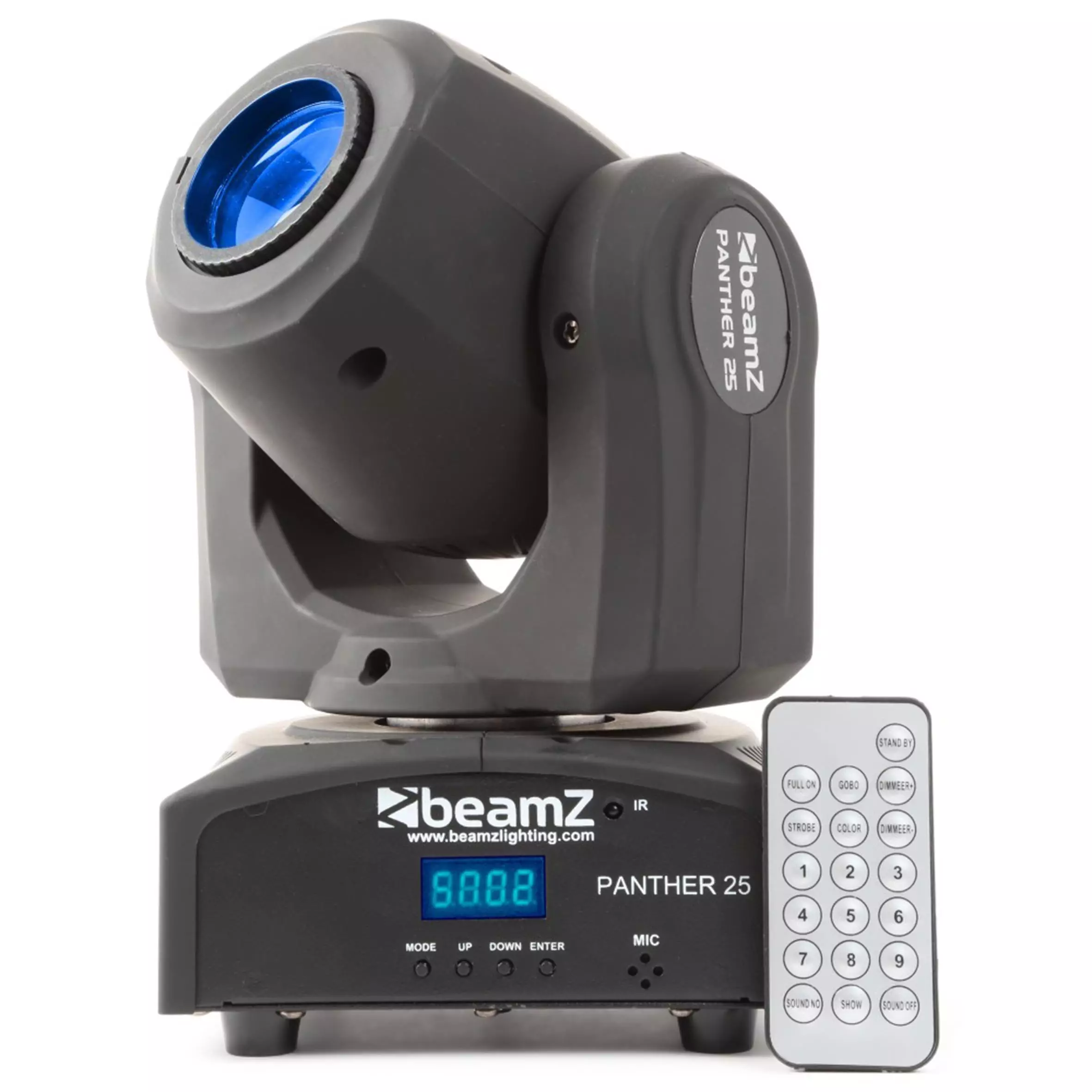 A compact Panther moving head with bright output. The 12W CREE LED produces a 13° beam. The moving head is equipped with both a colour and gobo wheel for ultimate control. The gobo wheel has 7 different gobos + open and the colour wheel has 7 colours + white. This Panther moving head works in DMX, stand-alone mode or with IR control. When operating in DMX mode you can choose 3 DMX channels modes