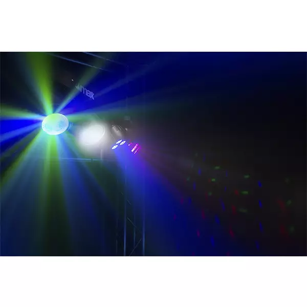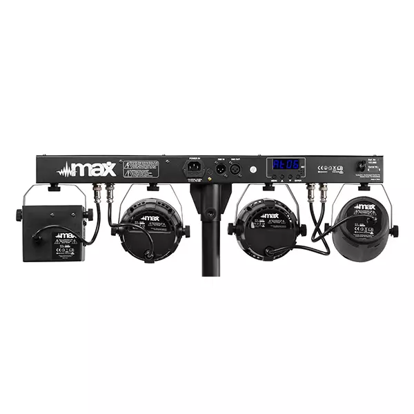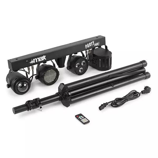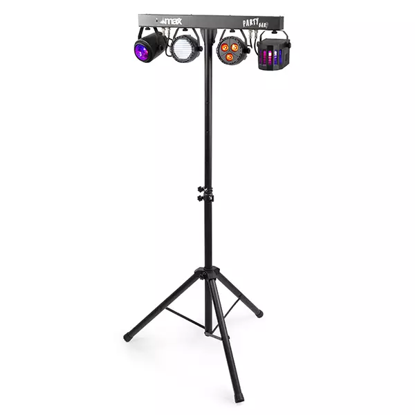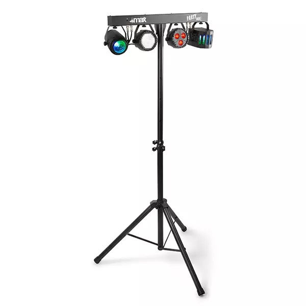The MAX PartyBar Series consists of a number of complete kits fitted with spectacular LED light effects. All sets are provided with high-intensity LEDs in different colours. This series of Party Bars is plug and play and can be controlled via DMX, IR remote control or auto and sound-activated programs selectable from the control panel with LED display and push buttons. A tripod stand is included for quick and easy setup. Specially designed for stages, parties, entertainers and all other special events.