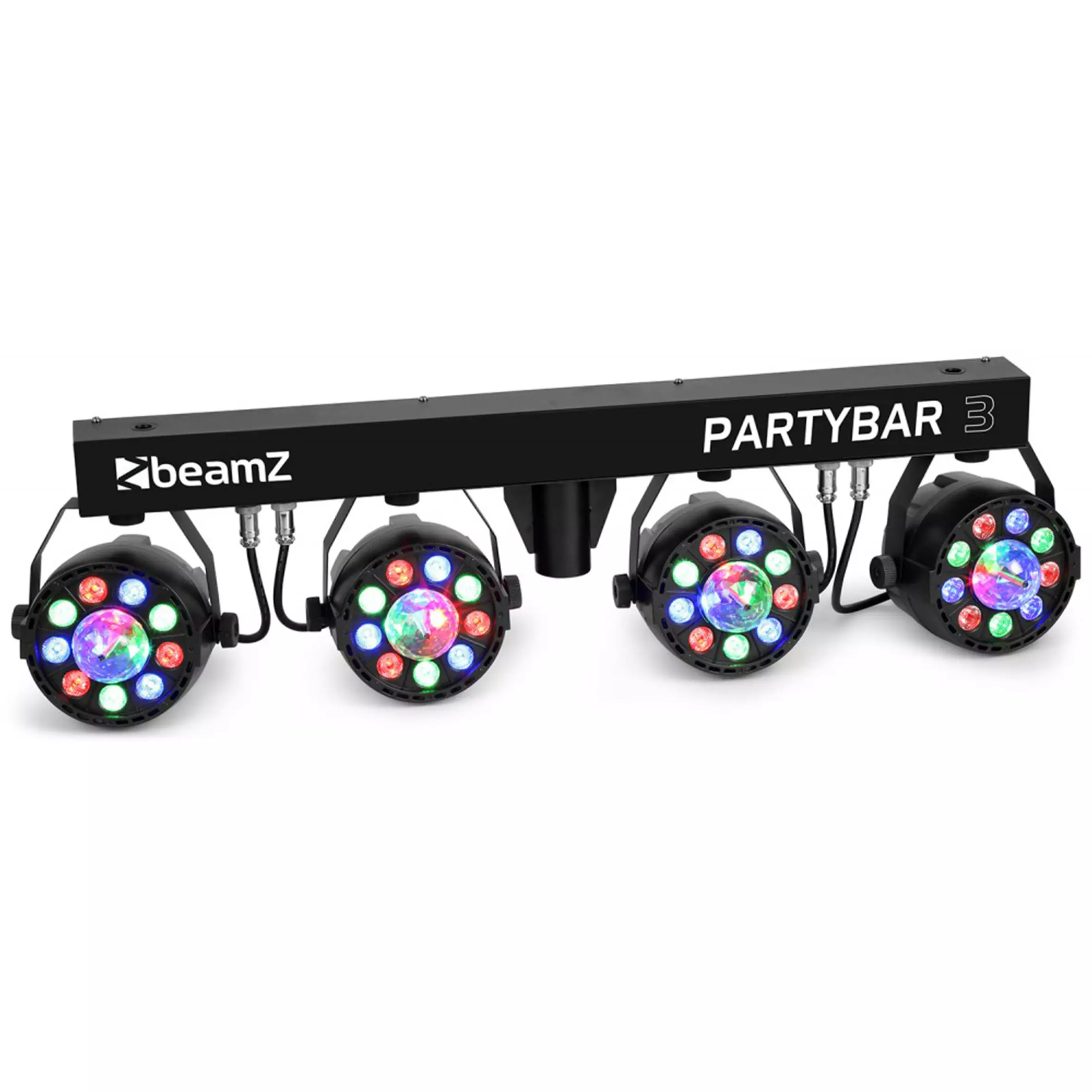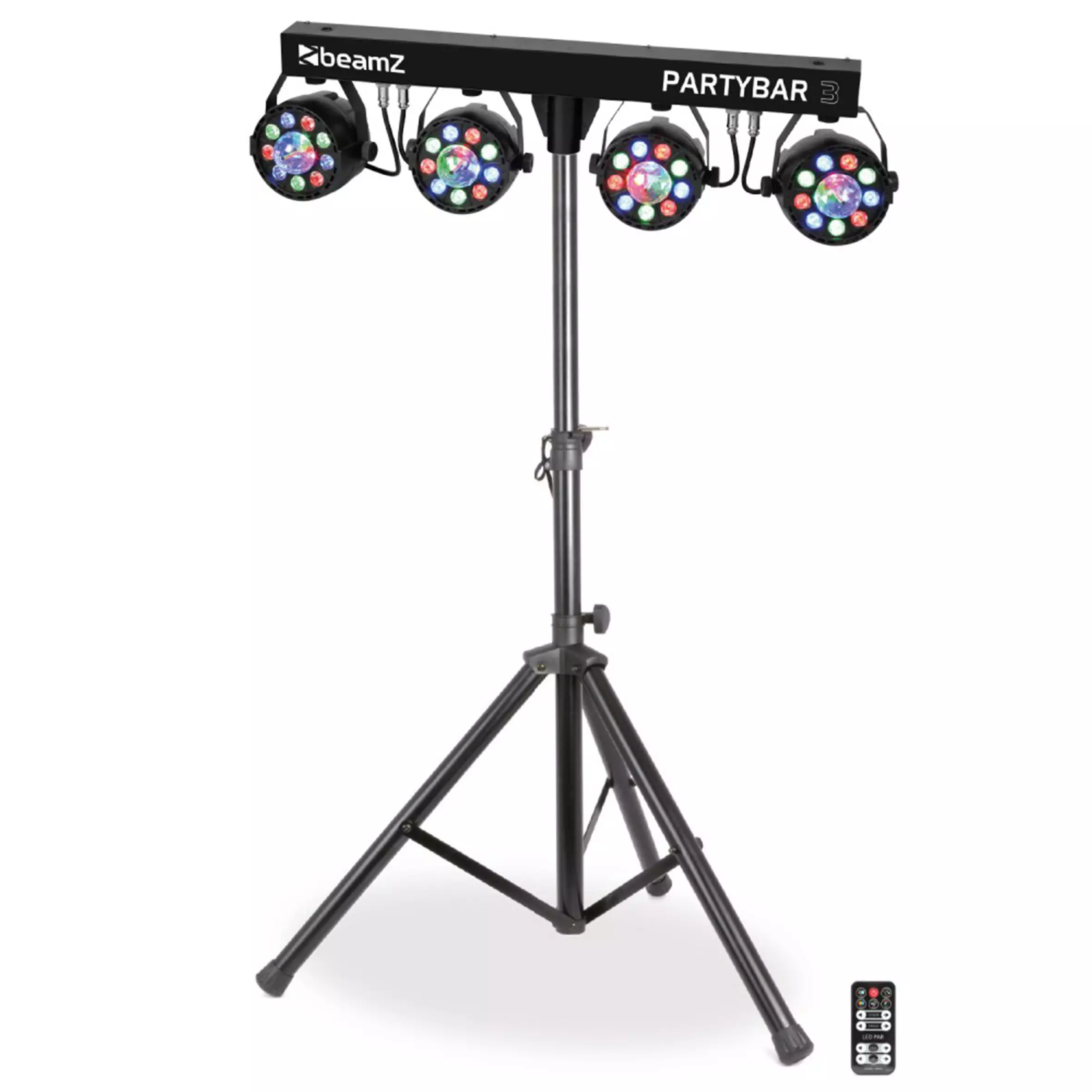 The Partybar3 is a sensational light show fitted with 4 PAR Cans (RGB LEDs) with built-in Magic Ball. This Partybar3 is plug and play and can be controlled via DMX, IR remote control or auto and sound-activated programs selectable from the control panel. A tripod stand is included for quick and easy setup. Specially designed for stages, parties, entertainers and all other special events.