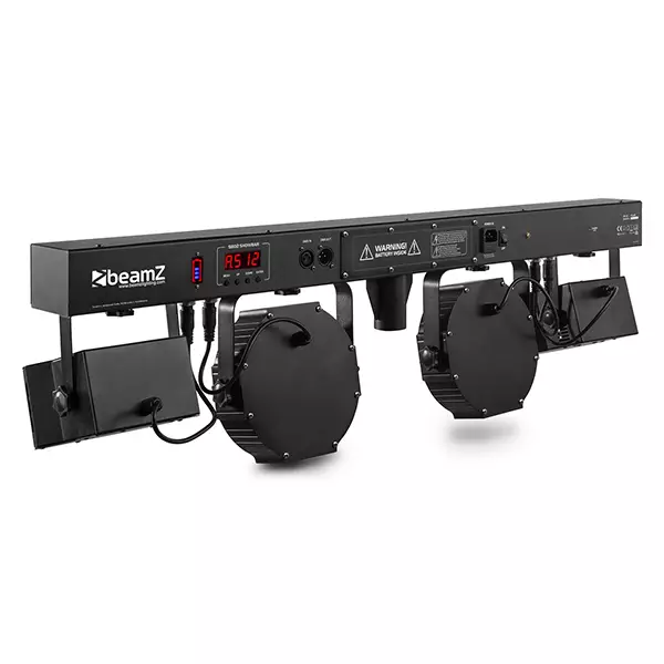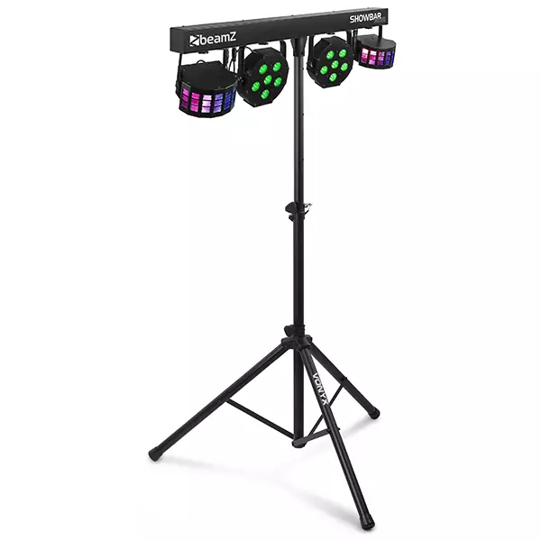The SB02 ShowBar kit is a rechargeable lithium battery powered Show Bar containing 4 effects mounted on a DMX T-bar. It ‘s equipped with 2 LED Derby effect lights and a pair of high power LED pars that guarantee a stunning light show. The T-bar can be controlled in auto mode, sound activated mode or 6/30-channel DMX mode and is also equipped with an IR sensor for controlling on distance by remote control. The SB02 ShowBar can be mounted on the included stand and the capacity of the battery can easily be read on the battery indicator.