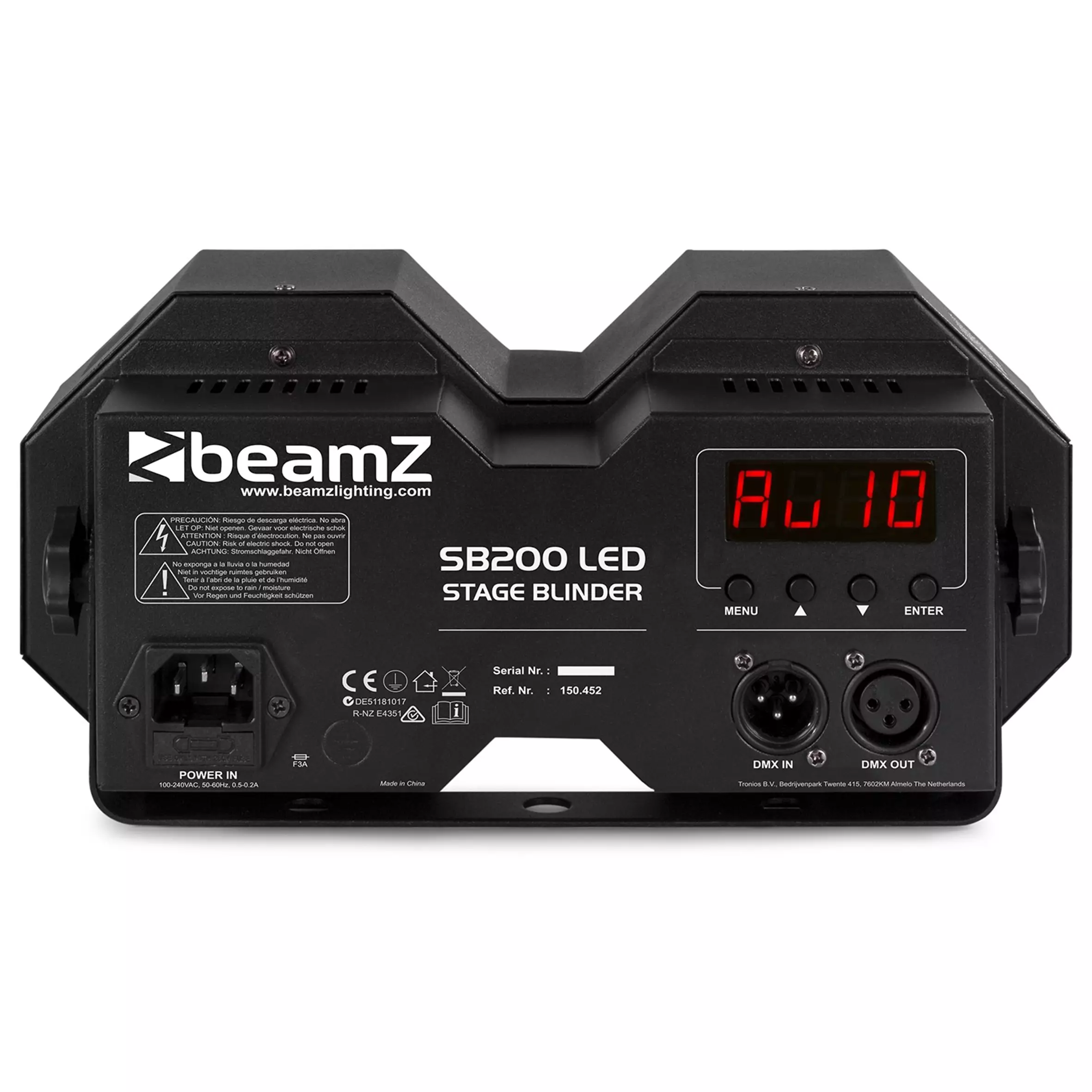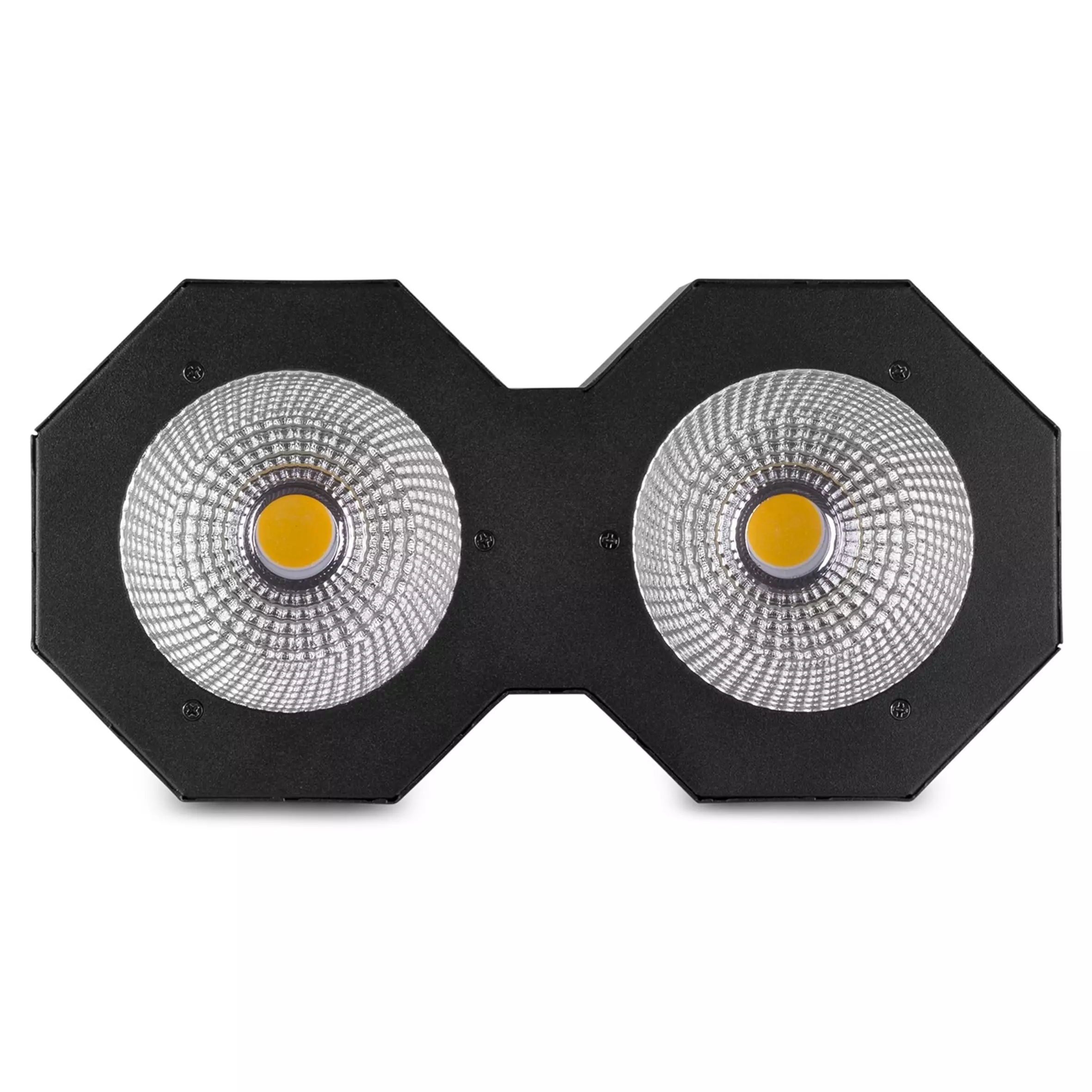 The SB200 Stage Blinder is a powerful LED lighting fixture with a rugged design featuring 2x 50W Chip-on-Board (COB) LEDs that combines two effects in its housing. In addition to a stage blinder, this fixture can also be used as a stroboscope. The SB200 matches the blinding light output of a conventional Audience Blinder and can be controlled in standalone mode, sound activation mode or directly via DMX in a 6-channel mode. The LEDs feature up to a 100,000 hour life expectancy. The colour of the LEDs is warm white.