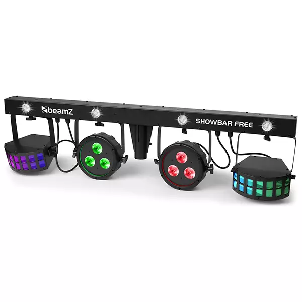 The SHOWBAR FREE kit contains 2 spectacular effects mounted on a DMX T-bar; a pair of LED Derby effect lights and a pair of LED pars. The T-bar contains 4 built-in 1W high power white LEDs to create an amazing strobe effect. Also equipped with an IR sensor for controlling on distance by remote control. Link multiple units together with IEC-connector and DMX. The SHOWBAR can be mounted on a 38mm stand or you can use the mounting brackets on both sides to mount it to the ceiling.