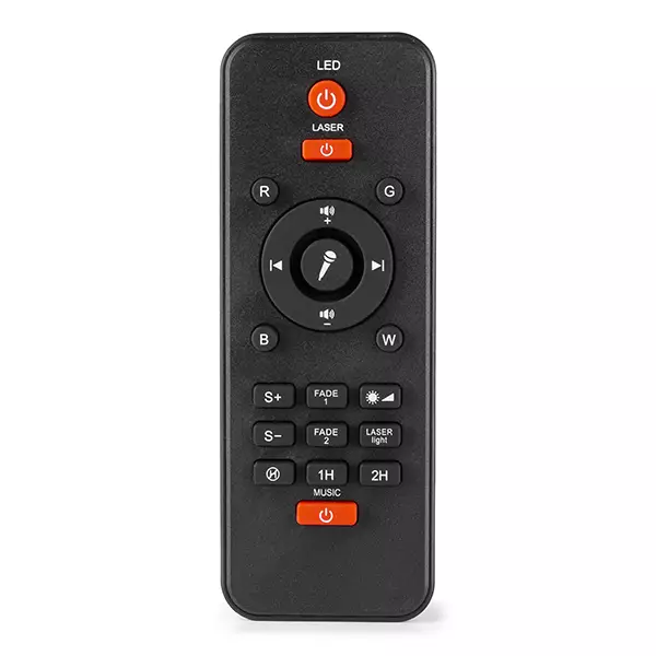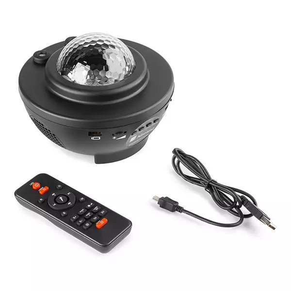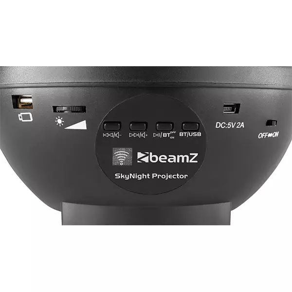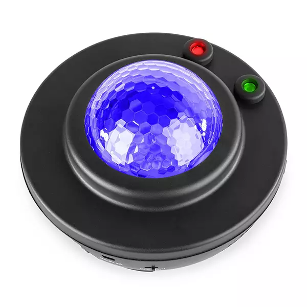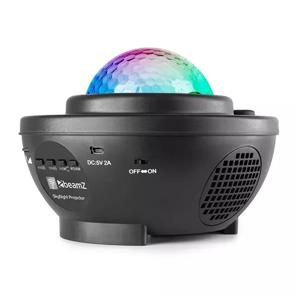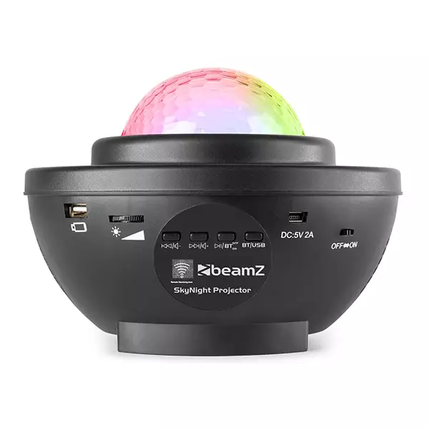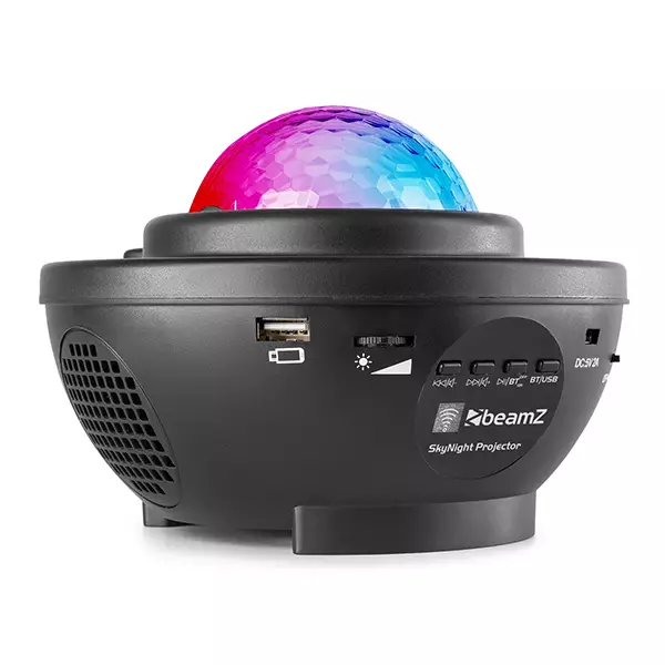 The SkyNight projector with built-in multimedia player can light up the entire room in a galaxy pattern along with red and green stars. With the rotating mechanism it also creates a water wave effect in many different colours. This magical effect allows you to enjoy both light and music at the same time, thanks to the built-in speaker. It works with smartphone, tablet (BT streaming) or just insert a USB stick.