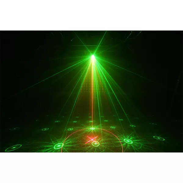 The Surtur II Double Red, Green and Blue LED. Creates a psychedelic atmospheric effect from unique red and green laser patterns and a blue LED wash, all built into one case. You can choose 8 different gobo lighting for a amazing effect. The Red and Green laser includes an IR remote control for wireless control and to switch between sound-activated or auto programs. In DMX mode you also have total control of all patterns. There are safety features like a key switch and an interlock interface. The lightweight case design makes it ideal for mobile entertainers, bands, night clubs, bars, and anyone looking to lighten up a party