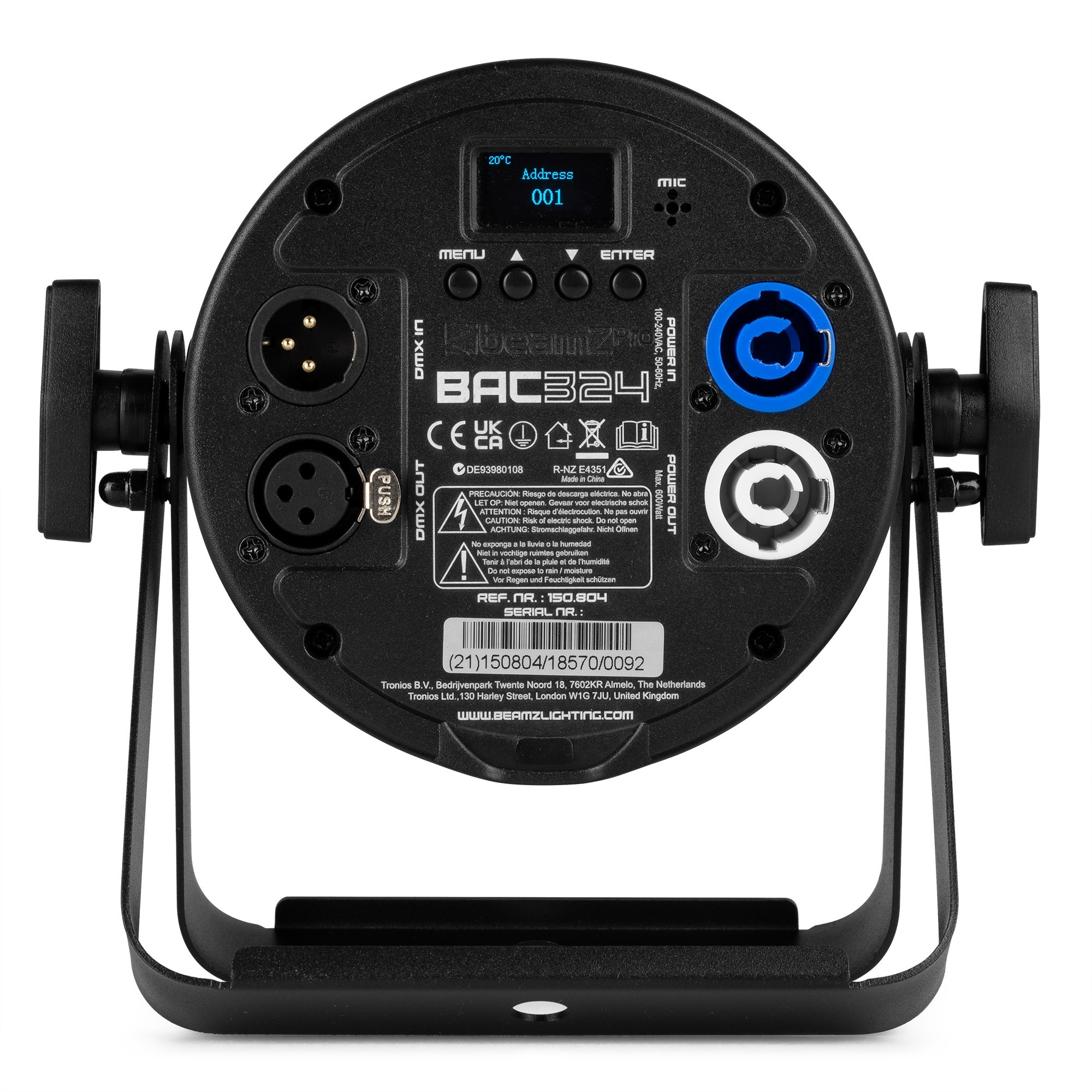 The beamZ BAC3 series is series of compact aluminium LED ProPars, developed according to the latest LED technology. The combination of high-power LEDs built into an attractive cast aluminium housing ensures highly efficient heat dissipation. This eliminates the need for an internal fan, making this Par absolutely silent in operation. The OLED display with 4 button LED menu allows for easy access to the functions including DMX, master/slave, sound activation and the stand alone function. Equipped with P-Con in/out and XLR 3-pin in/out connectors for daisy chaining multiple units together. Magnet in front for optional accessories: Filter 40° (150.812), Barndoor (150.813)