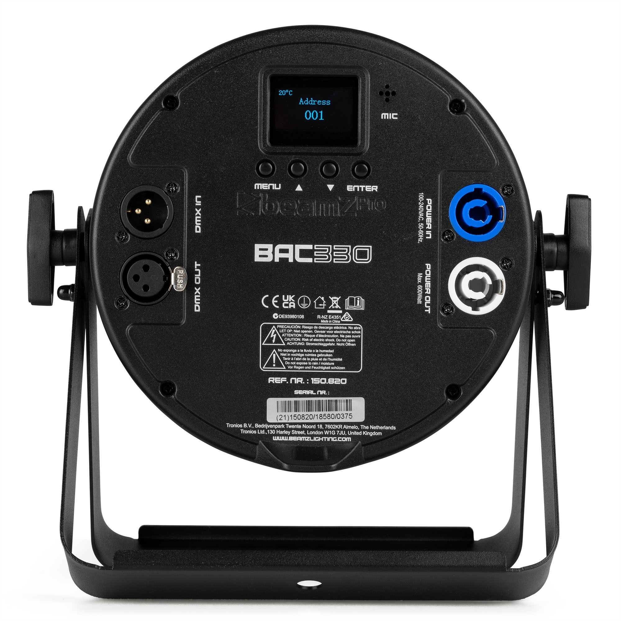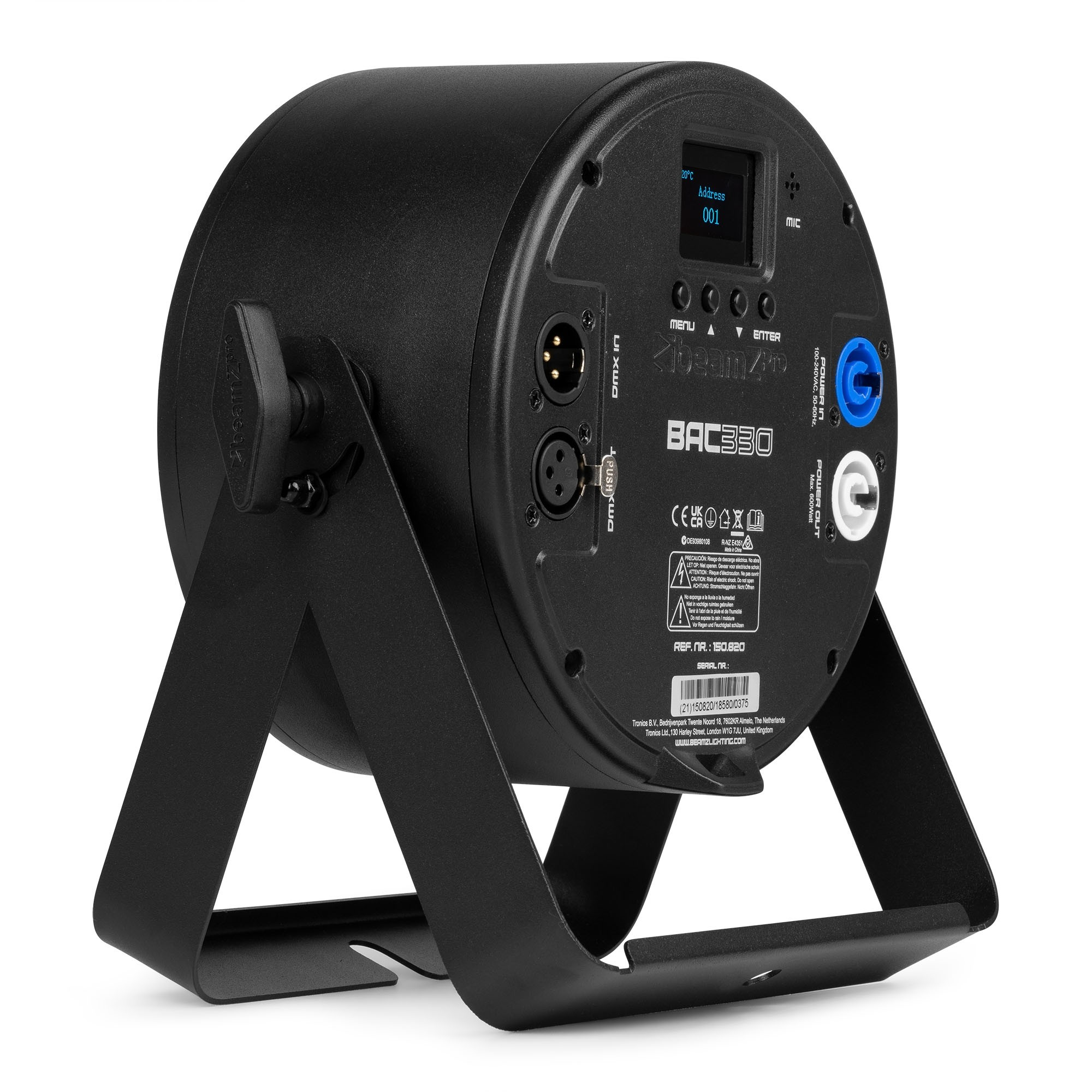 The beamZ BAC3 series is series of compact aluminium LED ProPars, developed according to the latest LED technology. The combination of high-power LEDs built into an attractive cast aluminium housing ensures highly efficient heat dissipation. This eliminates the need for an internal fan, making this Par absolutely silent in operation. The OLED display with 4 button LED menu allows for easy access to the functions including DMX, master/slave, sound activation and the stand alone function. Equipped with P-Con in/out and XLR 3-pin in/out connectors for daisy chaining multiple units together. Magnet in front for optional accessories: Filter 40° (150.832bB, Barndoor (150.833B)