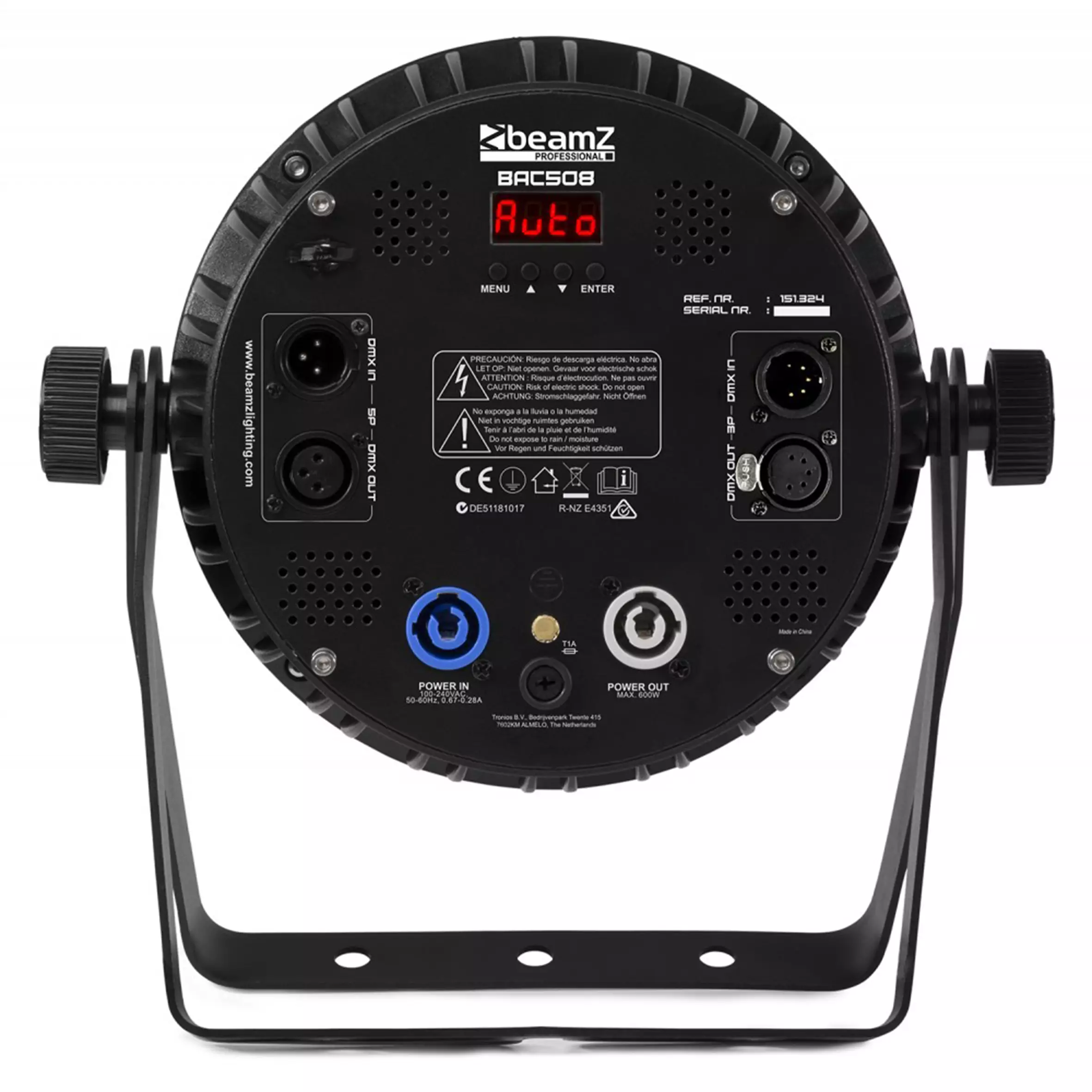 The BeamZ BAC508 is an aluminium LED ProPar, created by the latest LED technology. This robust ProPar with 12x 14 7-in1 LEDs is suitable for a wide range of applications from uplighting a large venue to lighting a stage for live performances. Highly efficient, natural convection cooling thanks to the attractive cast aluminium housing with heat sink design. There are no internal cooling fans in these PAR cans, which mean absolutely zero noise. Equipped with Power Connection in/out and XLR 3-pin and 5-pin in/out for daisy chaining multiple units together.
