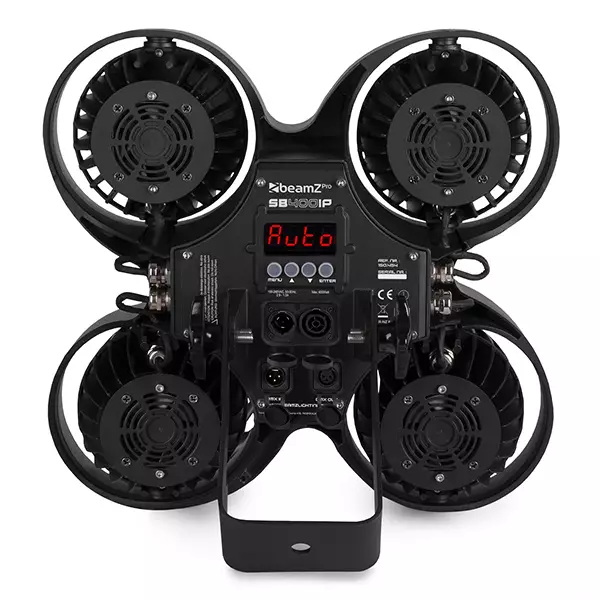 The IP65 rated SB400IP Stage Blinder is a powerful LED lighting fixture with a rugged aluminium design featuring 4x 100W Chip-on-Board (COB) LEDs that combines two effects in its housing. In addition to a stage blinder, this fixture can also be used as a stroboscope. The SB400IP matches the blinding light output of a conventional Audience Blinder and can be controlled in standalone mode, sound activation mode or directly via DMX in a 4 or 8-channel mode. The LEDs feature up to a 60.000 hour life expectancy. The colour of the LEDs is warm white.