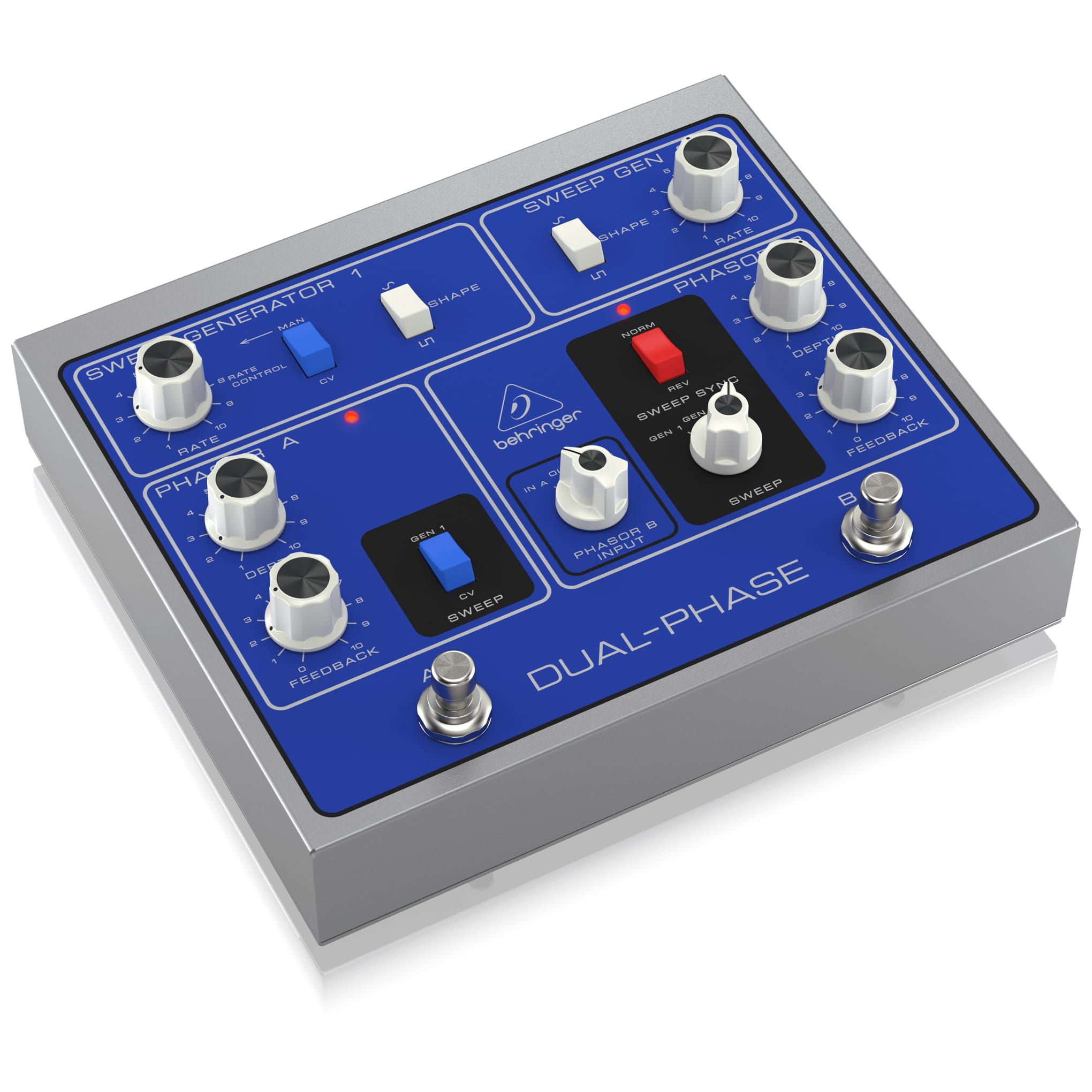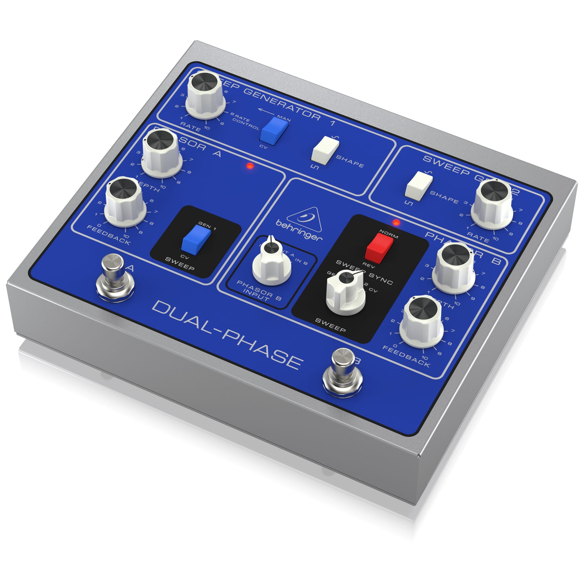 | Phasor B | Sweep sync: 1 x rocker switch Normal / reverse phase, switchable Sweep: 1 x rotary switch Sweep generator 1 / generator 2 / control voltage, switchable Depth: 1 x rotary knob Feedback: 1 x rotary knob |