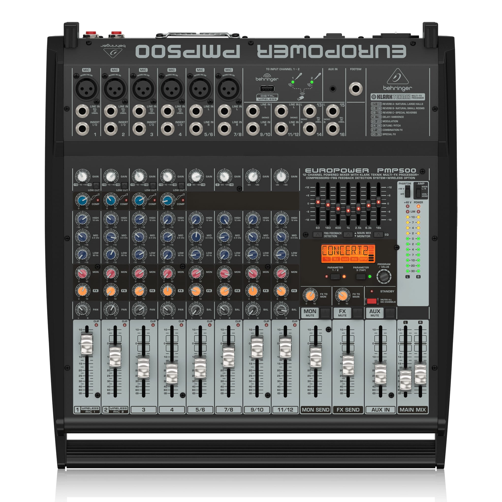 500W 12-Channel Powered Mixer with Klark Teknik Multi-FX Processor, Compressors, FBQ Feedback Detection System and Wireless Option