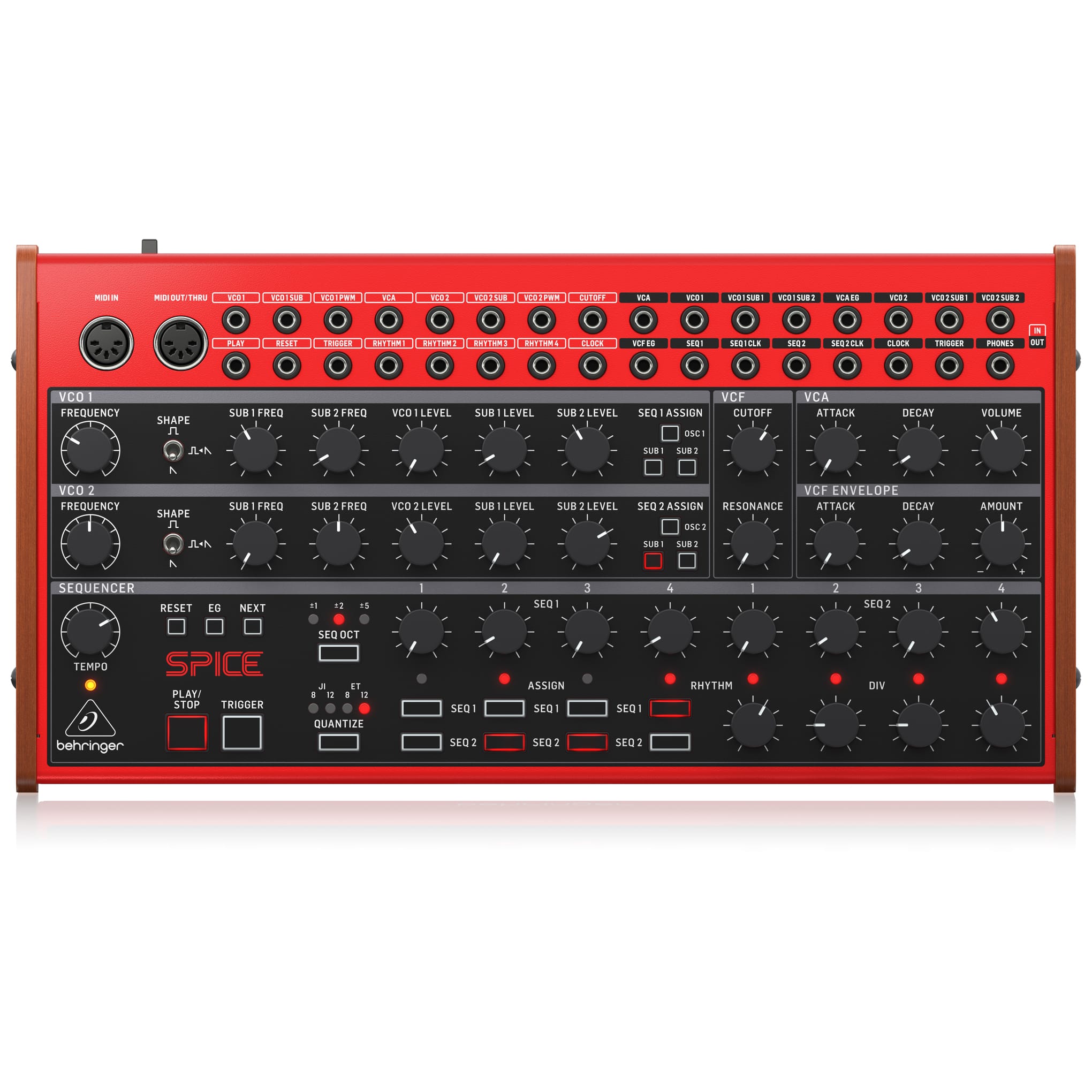 | Outputs | 16 x 3.5 mm TS jack, DC coupled, normalled VCA, VCO 1, VCO 1 Sub 1, VCO 1 Sub 2, VCA EG, VCO 2, VCO 2 Sub 1, VCO 2 Sub 2 VCF EG, Seq 1, Seq 1 Clock, Seq 2, Seq 2 Clock, Clock, Trigger, Phones |