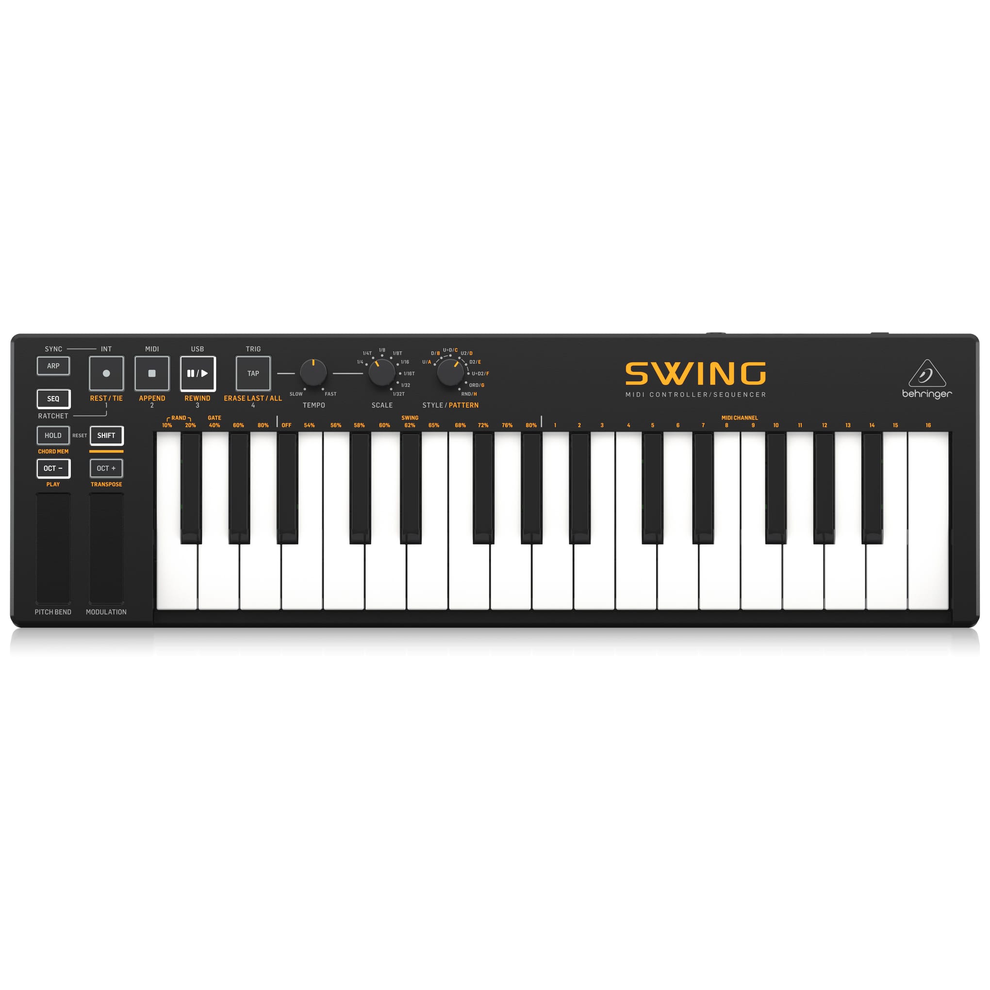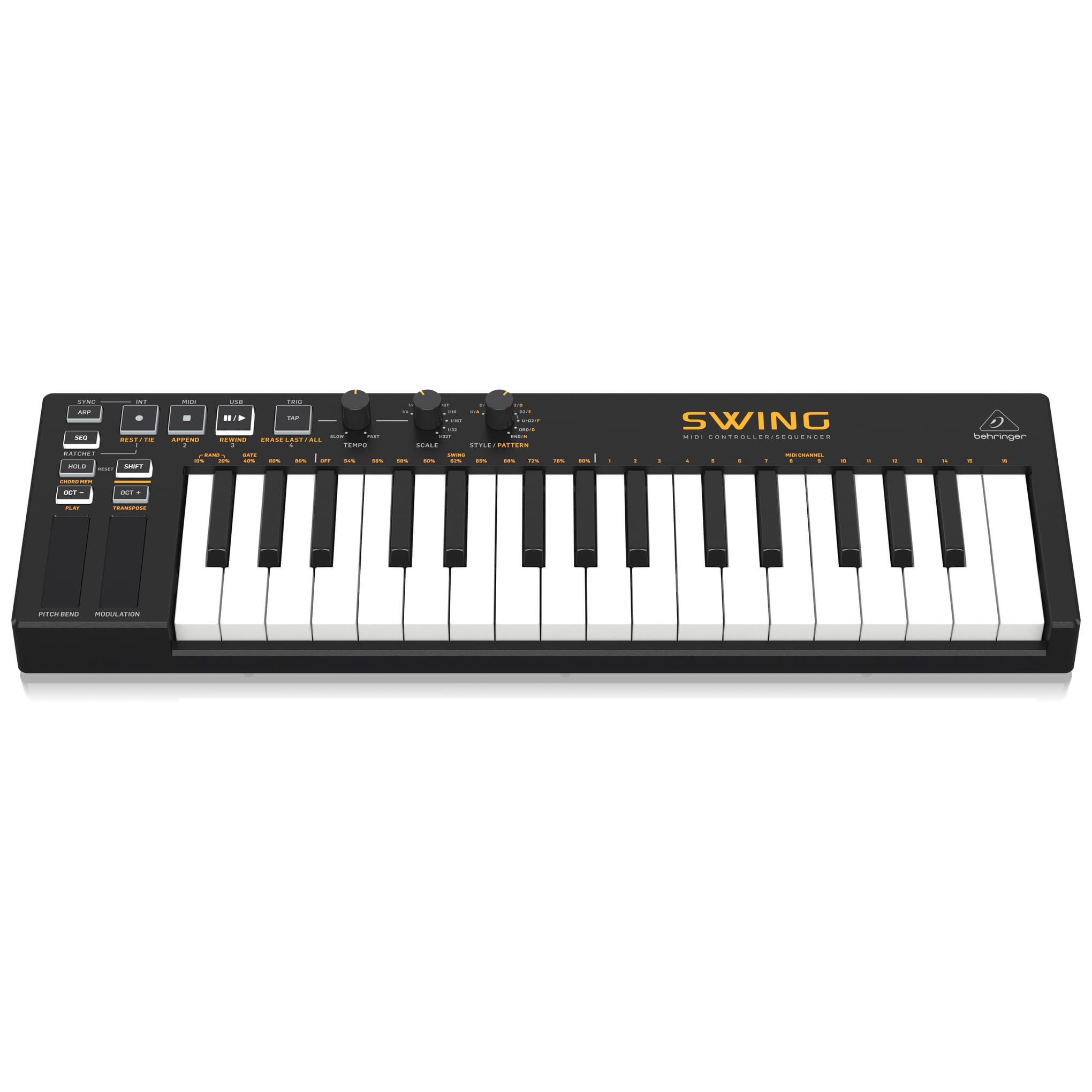 The Behringer SWING gives you full control over any synthesizer or virtual instrument in your DAW via USB or MIDI. Featuring a 64-step sequencer with an 8-note polyphonic sequence combined with 32 compact-sized keys and pitch and modulation touch-strips provide unlimited ways to express yourself in a compact and portable package.