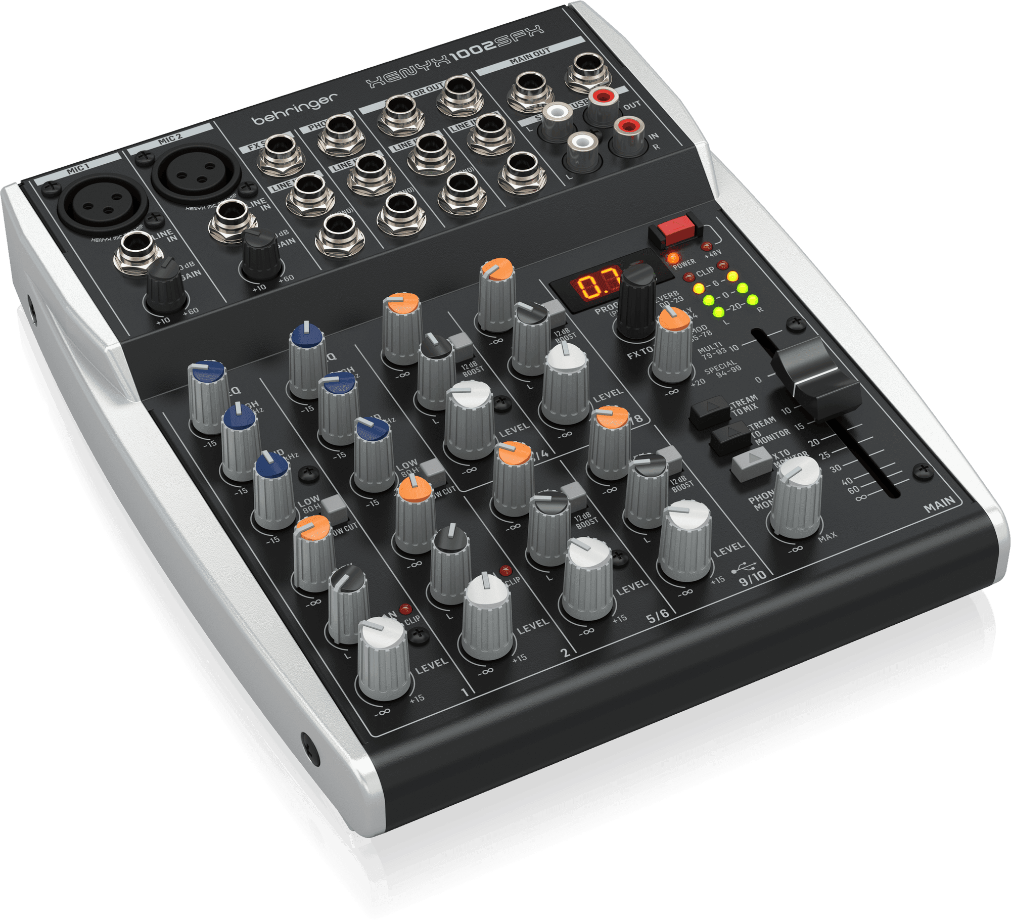 The FX send control per channel lets you use the internal stereo effects programs and/or plug in any external FX processor of your choice, for amazing audio effects flexibility. When nothing is plugged into the stereo line inputs 9/10, then the stereo 9/10 channel will receive the USB input signal and its control can be used to adjust the USB level conveniently.