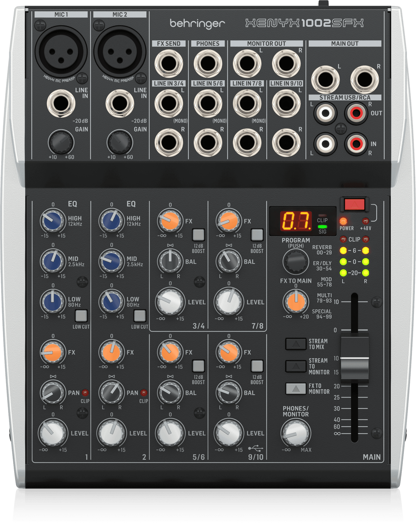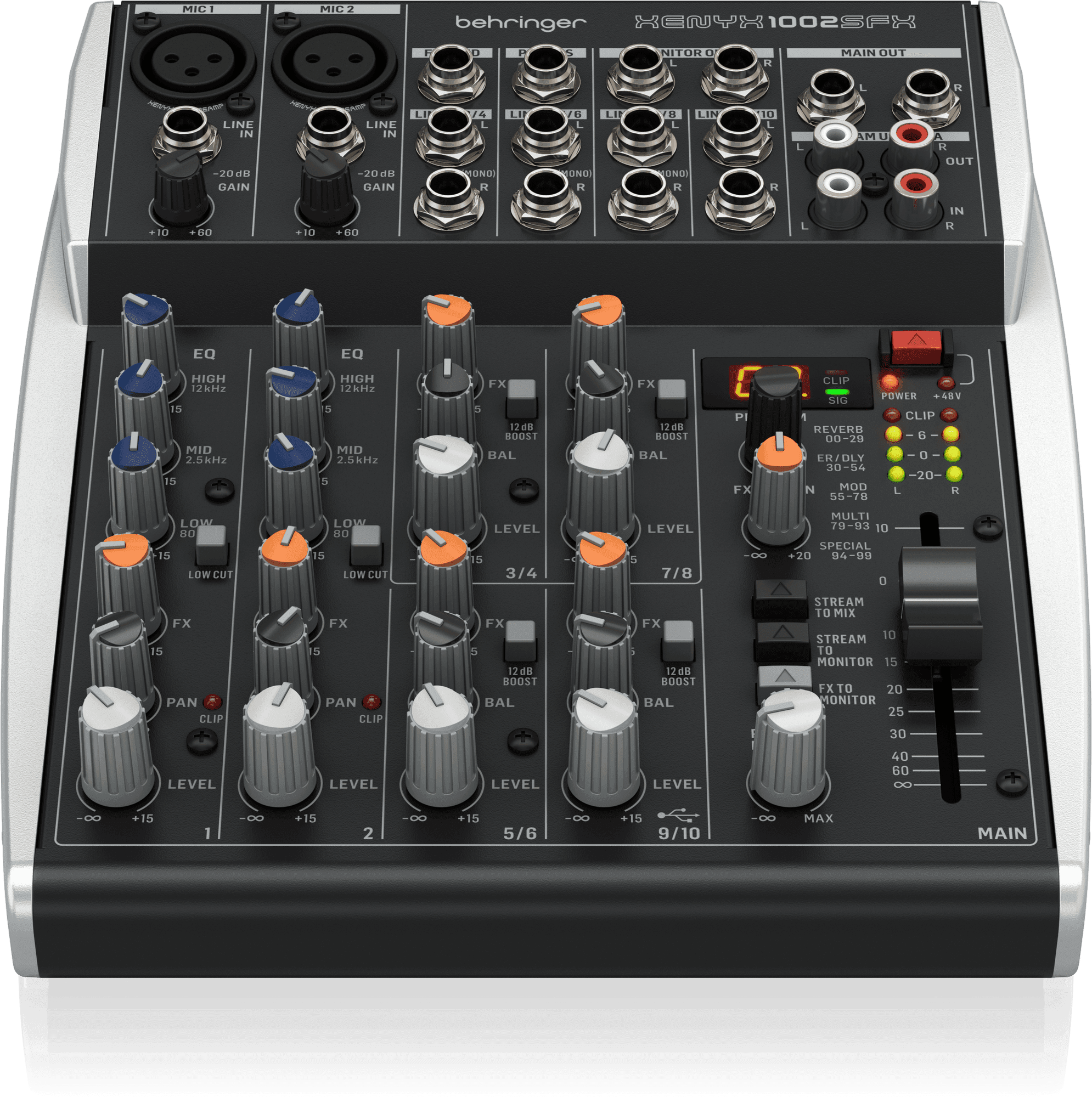The 1002SFX features level, panorama/balance and effect send controls on all channels and allows for precise sound shaping for any input source. Mono channels have additional Gain controls and 3-band EQ with switchable Low Cut, while stereo line-level channels offer a switchable 12 dB boost.