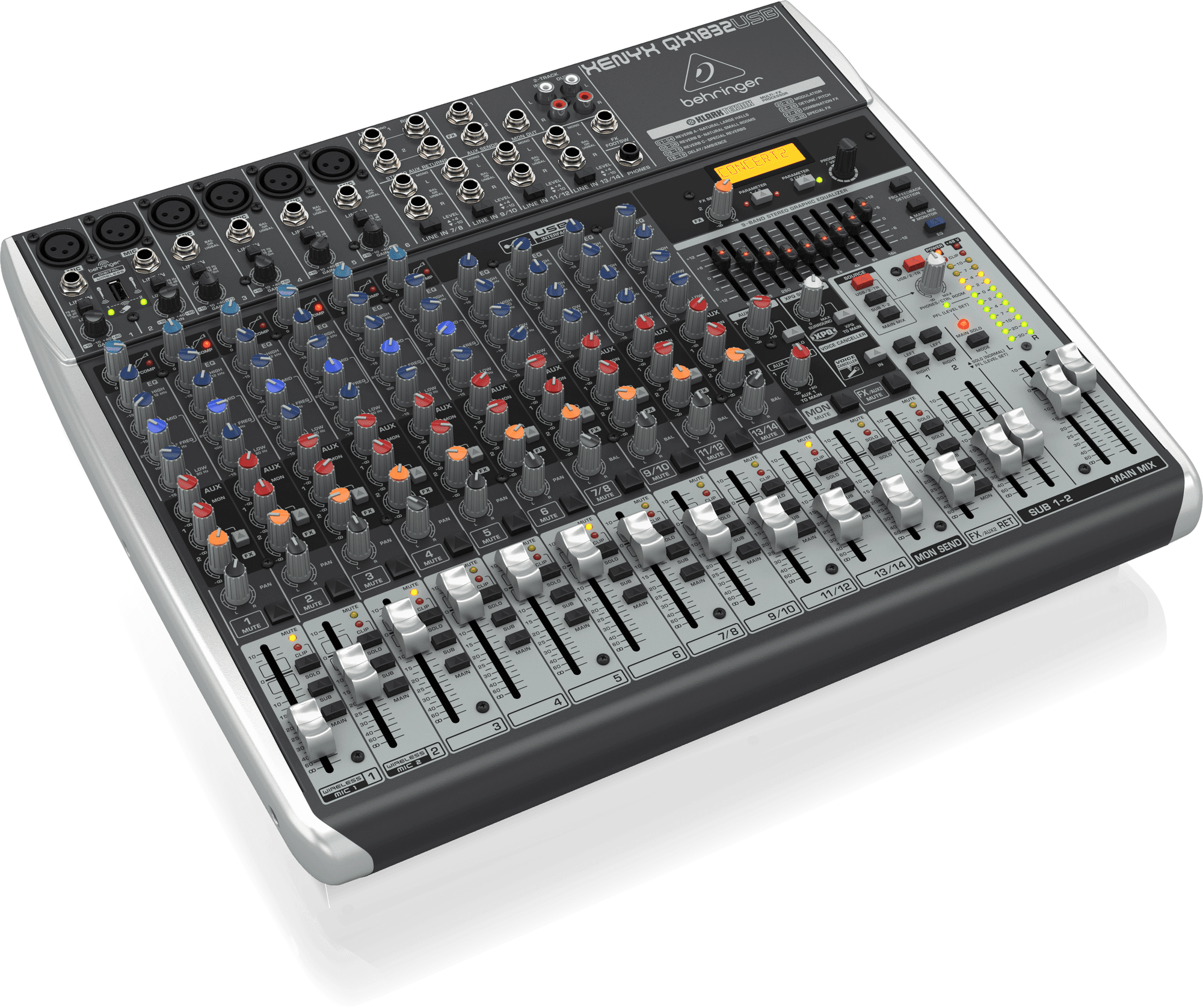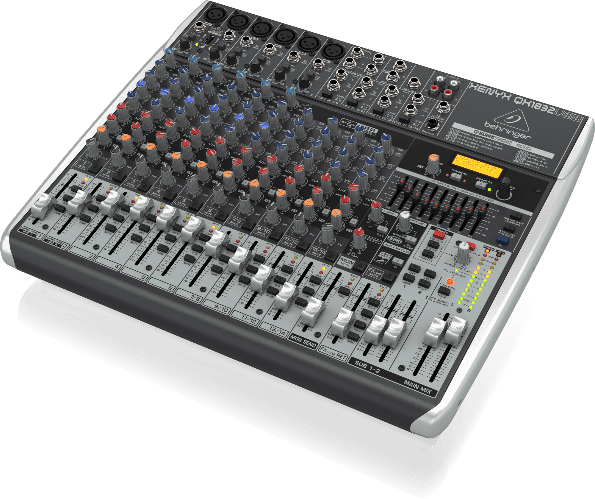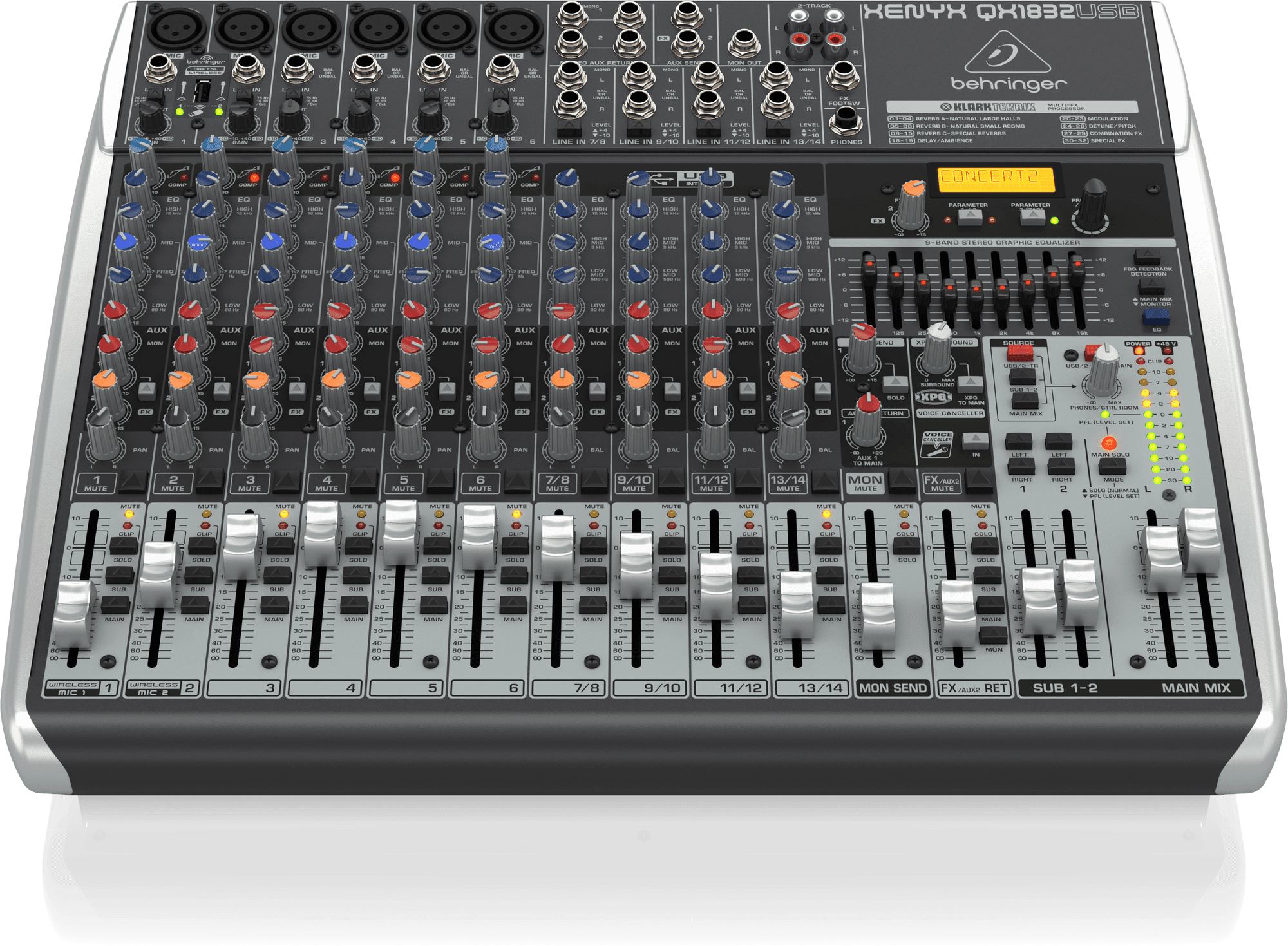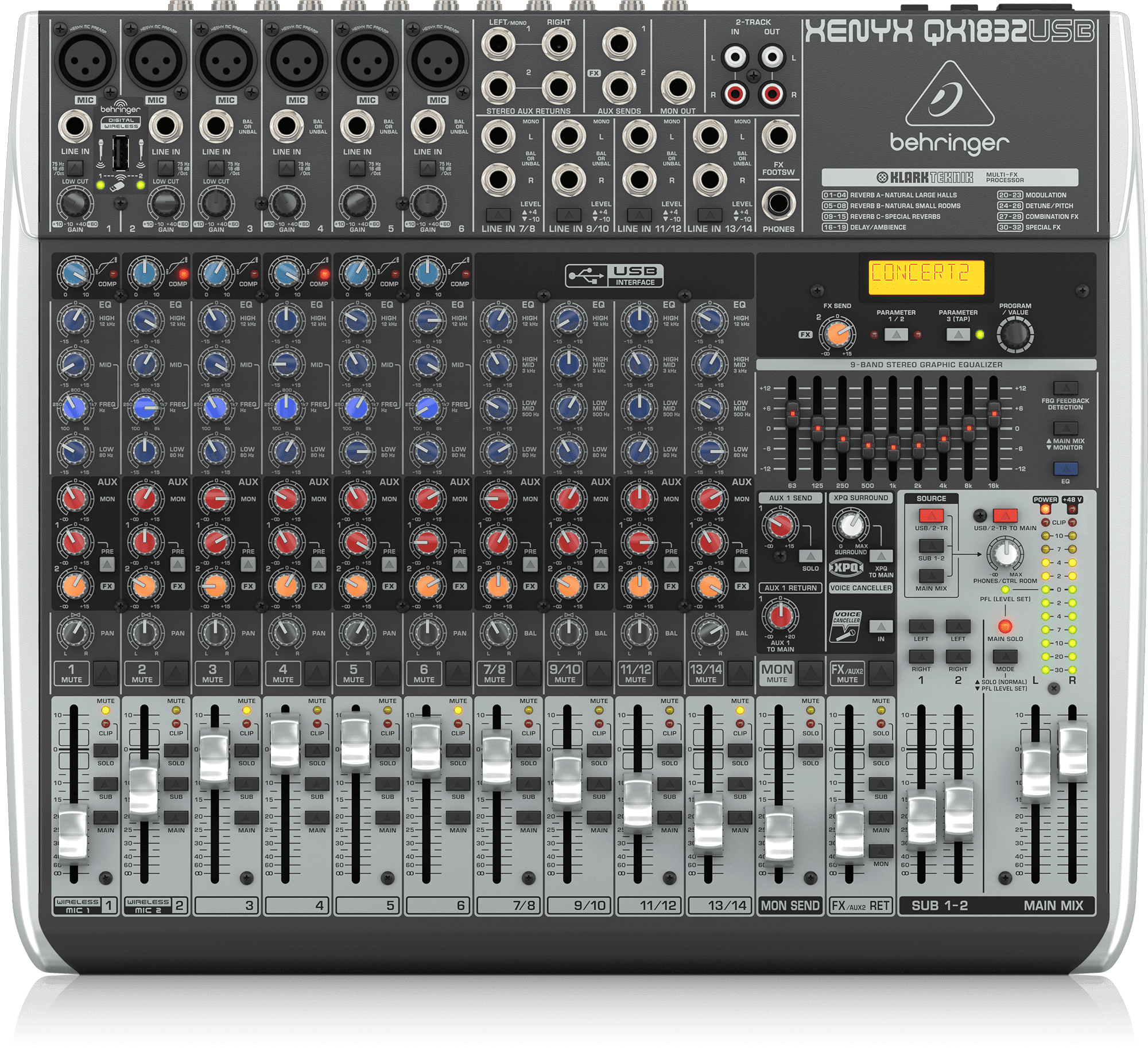The feature-packed XENYX QX1832USB mixer allows you to effortlessly achieve premium-quality sound thanks to its 6 onboard studio-grade XENYX Mic Preamps and ultra-musical “British” channel EQs – with a semi-parametric mid band for warm and musical sound. And our easy-to-use “one-knob” compressors provide total dynamic control for the ultimate in punch and clarity, while respecting all the power and emotion you pack into every note. Add to this our Klark Teknik FX processor with 32 studio-grade presets with dual addressable parameters, Tap function and storable user parameter settings – and the QX1832USB becomes an incredibly versatile mixer for your live performances.